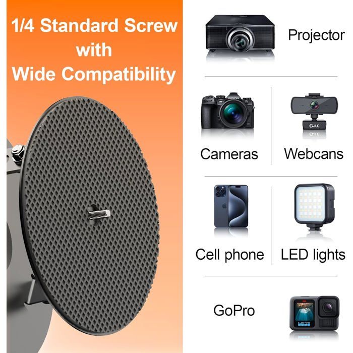 Convient aux projecteurs avec filetage 1/4" (ou M4 ou M6), et pesant moins de 13,6 kg; Support de plafond 3 en 1 pour projecteur Compatibilité universelle pour une utilisation multi-appareils : fonctionne avec tous les projecteurs à vis standard de 6,35 mm, les appareils photo et même les clips de smartphone. Trépied Videoprojecteur Suptek Support Pivotant à 360°, Canapé Contre Le Mur, Hauteur Réglable, Compatible Avec Caméra Vidéo Vlog DVR PR001FP Support Projecteur Pivot 360 Pour Lit Canapé Hauteur réglable pour un placement flexible : la hauteur du support de projecteur s'étend de 19 cm à 32 cm, permettant un réglage facile de la hauteur en fonction de votre angle de vue. Alliage d'acier robuste pour une stabilité solide : fabriqué en alliage d'acier épais à haute résistance, ce support ne se plie pas et ne vacille pas, même avec des projecteurs lourds. La base enfichable garantit un glissement sans glissement, gardant votre appareil bien en place. Comment fonctionne un vidéoprojecteur ? - L' SOS Accessoire Drsn Support Vidéoprojecteur Plafond Réglable 35-60cm -Jusqu'à 3 kg Pas de perçage nécessaire : économise de l'espace et des efforts : s'adapte aux espaces étroits de 2 cm (par exemple, entre les meubles ou les murs) sans perçage. Un support polyvalent pour la maison, le bureau ou les projets créatifs. Pivote à 360° et inclinaison à 90° pour un contrôle de visualisation ultime : profitez d'une rotation horizontale complète à 360° et d'un réglage de la hauteur de 90° pour projeter à n'importe quel angle.