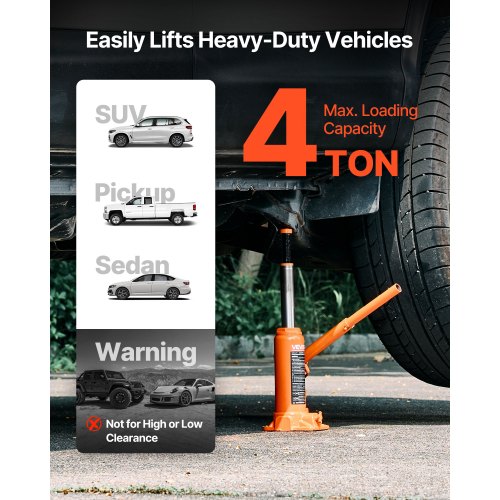 Il lève de 260 mm à 495 mm, grâce à une vis de 65 mm permettant un réglage précis de la hauteur, pratique lorsque l'espace est restreint Cric Bleu Résistant VEVOR Cric Hydraulique Electrique 5 T 12 V DC Cric De Voiture Automatique Levee 155-450 Mm Cric De Levage Avec Lampe LED Gonfleur De Pneus Coffret Pour Depannage Routiere Demonte-Pneus SUV Berline Cric Bouteille Hydraulique 20 Tonnes 2 façons de pomper Connectez le cric bouteille à grande levée à un compresseur d'air grâce au raccord rapide pour un levage plus rapide et plus facile, idéal pour les tâches plus importantes. Grâce à sa grande résistance aux intempéries, il réduit le risque de gonflement des joints d'étanchéité ou de gel du liquide. Avant l'achat, vérifiez la garde au sol de votre véhicule afin d'assurer un ajustement et une hauteur de levage adéquats. Poids du produit : 29,8 lb/13,5 kg Conception protectrice : Le cylindre en alliage d'aluminium du cric-bouteille assure une étanchéité parfaite pour des performances durables. Spécification Numéro de modèle de l'article : MR8004 Large plage de levage : De bas en haut, ce petit cric bouteille offre une portée impressionnante. Il lève de 260 mm à 495 mm, grâce à une vis de 65 mm permettant un réglage précis de la hauteur, pratique lorsque l'espace est restreint Cric Bouteille Hydraulique Pneumatique-VEVOR-Capacité 20 T-Plage de Levage 260-495 mm-avec Pompe-Bleu. Promo. Remise personnelle Il fonctionne même par temps extrêmement chaud ou froid : pas de gel d'huile, pas de joints gonflés, juste des performances fiables Portée de levage moyenne Avec une plage de levage de 260 à 495 mm (10,2 à 19,5 pouces), ce cric bouteille convient à la plupart des véhicules. Pas d'air comprimé ? Aucun problème. Charge nominale : 44 092 lb/20 t Des ressorts doubles réinitialisent rapidement le piston, vous permettant ainsi de travailler sans effort Caractéristiques principales Selle antidérapante Le cric-bouteille hydraulique est doté d'une selle antidérapante. Contenu du coffret 1 x cric bouteille hydraulique, 2 tiges de poignée Large application : Fabriqué en fonte robuste et en acier au carbone, ce cric robuste est idéal pour la manutention d'engins agricoles et de chantier lourds. 1 x Manuel d'utilisation Le levage de charges lourdes simplifié Ce cric-bouteille hydraulique manuel et pneumatique utilise la force hydraulique pour soulever jusqu'à 20 tonnes avec stabilité. Hauteur de vis réglable : 2,6 po/65 mm Passez en mode manuel et soulevez avec la poignée : idéal pour une utilisation sur la route ou en cas d'urgence. Une soupape intégrée évite les surcharges et l'orifice de remplissage d'huile est étanche. Pas d'air comprimé ? Passez en mode manuel et continuez à travailler, que vous soyez à l'atelier ou sur le terrain Cric Bouteille Hydraulique VEVOR Pneumatique 20 T, pour Dimensions du produit : 9,3 x 6,1 x 10,2 pouces/235 x 155 x 260 mm Large plage de levage : De bas en haut, ce petit cric bouteille offre une portée impressionnante.