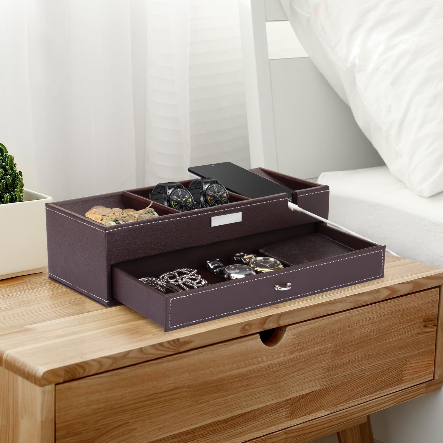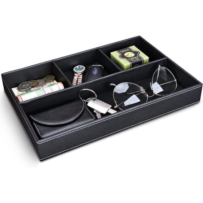 Emballage complet : comprend un plateau en cuir prêt à être utilisé immédiatement pour vous aider à organiser vos articles personnels. Organisateur Bijoux Clés Vide Poche Entree Boîte De Rangement En Cuir PU Réglable Pour Boîtier De Rangement Pour Maquillage, Bijoux Rangement Cuir En Solde Organisation Bijoux Clés Téléphone Utilisations polyvalentes : convient pour les tables de chevet de chambre, les bureaux, les comptoirs de salle de bain ou les tables d'entrée pour organiser les essentiels dans plusieurs pièces. Doté d'une construction en cuir synthétique durable, ce plateau compact aide à garder vos affaires bien rangées et facilement accessibles. La taille portable vous permet de maintenir l'organisation partout où vous en avez le plus besoin. Utilisation polyvalente pour la maison et le bureau : ce plateau est idéal pour différents espaces, placez-le sur votre table de chevet, table d'entrée, bureau ou commode pour organiser de petits objets Tableau des tailles : 18,2 x 18,2 x 4,2 cm. Nightstand Tray Plateau De Valet En Cuir Marron - Organisateur De Burundi Valets De Chambre Noir 【Construction en cuir PU durable】: fabriqué en cuir synthétique de qualité qui conserve son aspect sur diverses surfaces telles que les bureaux et les tables de chevet. Utilisez-le pour organiser des montres, des pièces de monnaie, des boutons de manchette, des clés, des bijoux et d'autres petits effets personnels tout en réduisant l'encombrement dans vos espaces de vie.