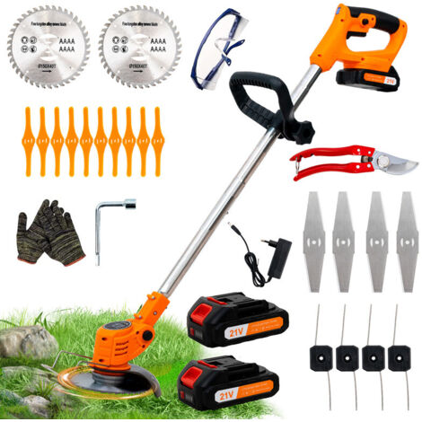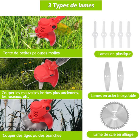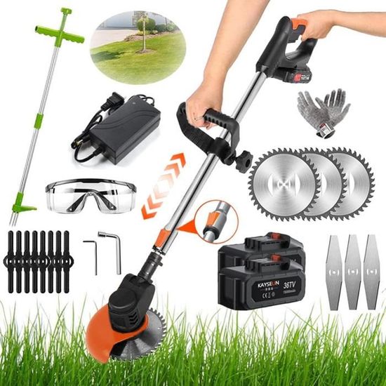 Débroussailleuse à Batterie Sans Fil Débroussailleuse Et Coupe Bordure 40V 2 Batteries Lithium 4Ah + Chargeur Double Lame 3 Dents Bobine De Fil Nylon Et Harnais VITO Débroussailleuse Sans Fil Emballage et service : 1 débroussailleuse sans fil ; 2 batteries 4., 0Ah ; 1 chargeur ; 1 lame de scie circulaire ; 2 lames métalliques ; 2 lames S ; 20 lames en plastique ; 1 paire de lunettes de protection ; 1 paire de gants antidérapants ; 1 petite clé rotative ; 1 roue ; 1 manuel d'utilisation (français non garanti). DéBroussailleuse à Batterie Electrique 21V 4.0AH Coupe Bordure sans Fil... OUTIGO Débroussailleuse sans fil avec batterie, 3 types de lames, 2 batteries de 21 V, télescopique et réglable, idéale pour le jardin et la terrasse. La Débroussailleuse à gazon alimentée par batterie est équipée d'un moteur sans balais en cuivre pur haute performance Deux batteries peuvent être remplacées que vous n'avez pas besoin d'attendre pour charger lorsque vous jardinez. Si vous rencontrez des problèmes, veuillez nous contacter immédiatement par e-mail. STEELITE Débroussailleuse sans fil 21 V, alimentation par batterie Les barres de fer anti-collision ne craignent pas d'être endommagées lorsqu'elles touchent des pierres dures ou un mur. Vitesse à vide de 18 000 tr/min (vitesse de travail de 6000 tr/min), permet de réaliser de grandes opérations sous de petites machines. Les lames circulaires en métal peuvent couper les branches et les buissons durs, les lames en acier inoxydable peuvent couper les tas de mauvaises herbes et l'herbe plus épaisse sur des terrains complexes, et 20 lames en plastique peuvent être utilisées pour couper l'herbe tendre ou la bordure de pelouse. Débroussailleuse avec 2 batteries : cette débroussailleuse est équipée d'une batterie au lithium améliorée de 2 x 4000 mAh qui peut être utilisée pendant environ 1 à 2 heures, résolvant efficacement le problème de courte durée de vie de la batterie. Vous pouvez l'utiliser dans les jardins, les villas, les parcs, les pâturages, les pelouses, les mauvaises herbes, les buissons, en particulier pour les jardins domestiques. Design sûr et confortable : débroussailleuse électrique sans fil avec double bouton de sécurité, vous devez appuyer sur le verrou de sécurité et le déclencheur en même temps pour démarrer la débroussailleuse à batterie, assurant votre sécurité. Veuillez le charger complètement avant la première utilisation pour obtenir le temps de fonctionnement prévu. La batterie de débroussailleuse sans fil est dotée de multiples fonctions en une : débroussailleuse, tondeuse à gazon, facile pour différents travaux de coupe, non limité par les fils, vous pouvez tondre n'importe où.