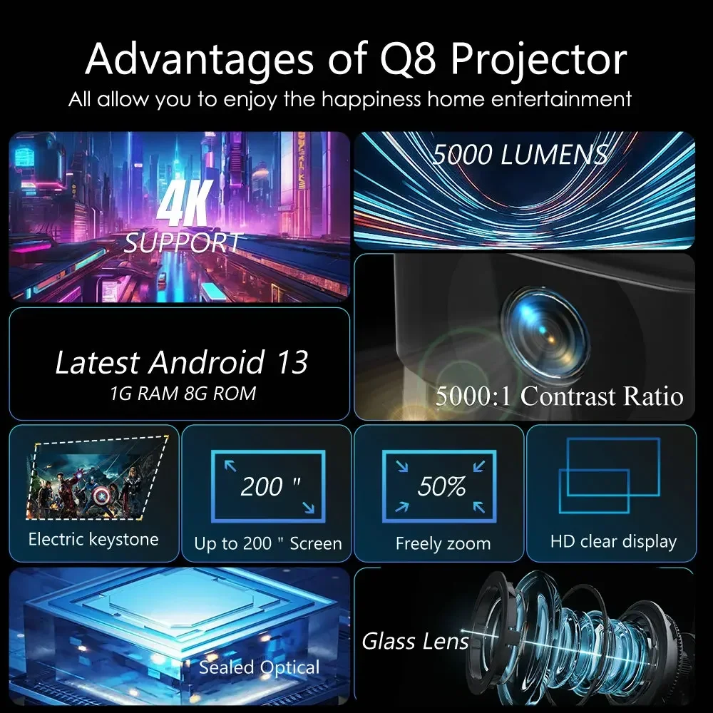 Transformez n'importe quel espace en salle de cinéma avec le projecteur VenirCool et l'écran, parfait pour les soirées cinéma en plein air ou le divertissement en intérieur. Projecteur 550 ANSI 8000 ISO Lumen Android 11 Projecteur Q3 Standard 550 ANSI/8000 ISO LUMEN Android 11 Projecteur Intelligent Android Nous vous présentons le projecteur VenirCool – Modèle de la série Q3, votre choix ultime pour un projecteur haute performance qui donne vie à votre divertissement. Plongez dans la résolution 1080p et la prise en charge 4K sur un écran FHD avec réglage d'image AI pour une expérience visuelle ultime. Améliorez votre configuration de divertissement avec le projecteur VenirCool Q3 Series, un mini projecteur intelligent doté d'un haut-parleur intégré, ce qui en fait le choix idéal pour une expérience de cinéma maison. Profitez d'une connectivité transparente avec la compatibilité Android 11, le WiFi et le Bluetooth, ce qui facilite la diffusion de votre contenu préféré. Le projecteur VenirCool dispose d'une luminosité puissante de 550 ANSI et de 8000 lumens ISO, assurant des images cristallines même dans des environnements bien éclairés. Emmenez le projecteur VenirCool Q3 Lite partout où vous allez, avec son design portable, sa longue durée de vie de la batterie et sa durabilité en plein air, parfait pour les soirées cinéma en plein air. Les fonctionnalités intelligentes de ce projecteur, y compris le réglage de l'image IA, garantissent une qualité d'image optimale pour chaque session de visionnage. Ce mini projecteur au design innovant offre une fonctionnalité inégalée avec des fonctionnalités de pointe pour répondre à tous vos besoins. Que vous soyez à l'intérieur ou à l'extérieur, ce projecteur portable offre durabilité et fiabilité pour tous vos besoins de visualisation. 01 Projector Review Konsoefuly Portable U2013 Full HD 1080P, 15 000 Lux, Correction Trapu00e9zou00efdale U00b130u00b0, Zoom 50%, Compatible Avec IOS/Tablette/PC/TV Stick/Clu00e9 USB/DVD Mini Projecteur Projecteur HORLAT avec WiFi 5G et Bluetooth, 550 ANSI Full HD 1080P... Équipé du dernier système d'exploitation Android 11, ce projecteur offre une compatibilité parfaite avec Android TV, vous permettant de diffuser facilement votre contenu préféré.