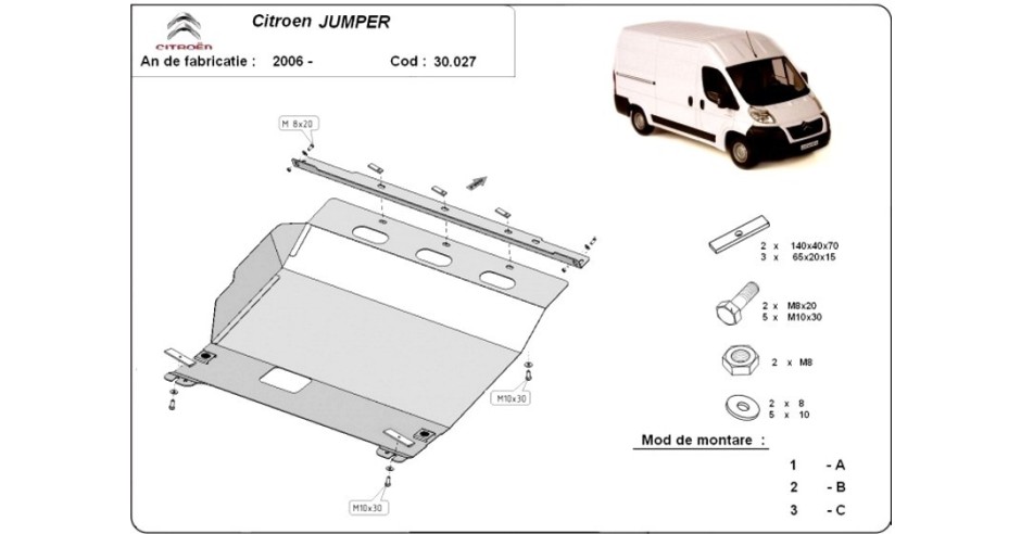 Protection anti-encastrement moteur compatible avec Citroën Jumper Scut Protection Conçu et fabriqué par notre entreprise, pour presque tous les véhicules. Cache sous moteur pour le moteur et la boîte de vitesses, dédiée aux voitures Citroen Jumper. Il est monté sans modifications sur la voiture, livré avec les accessoires de fixation Aucune homologation TUV ou ABE n'est nécessaire. - Durée de vie plus longue par rapport aux plaques en plastique ou en fibre de verre. Protection contre les rayures Accessoire Utilitaire Jumper 2006-2016 CLIPS + PLAQUE COUVERCLE CACHE PROTECTION SOUS MOTEUR Citroen Jumper Carter Protection Métal Jumper Aucune modification de la structure du véhicule n'est nécessaire pour l'installation et la garantie du véhicule est maintenue. - Si vous n'êtes pas satisfait de la qualité de notre produit, vous pouvez le retourner dans les 30 jours. PROTECTION EXTÉRIEURE DE VÉHICULE Boulons, écrous, clips et tout le matériel de fixation nécessaire sont fournis. châssis, Citroën 2CV, tôle de protection sous le moteur pour plateforme Avantages : - Plus grande résistance aux chocs et aux salissures de la route. Description Protégez votre Citroën Jumper II de 2006 à 2016 avec ce solide sous-pare-chocs en acier de 2 mm. Cette protection anti-encastrement est conçue pour protéger le moteur, la boîte de vitesses et le radiateur de votre véhicule, quelle que soit sa motorisation ou sa transmission