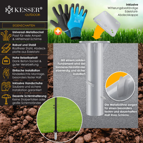 Cette installation empêchera le parasol de se balancer en cas de vent et de pluie, afin que vous et votre famille soyez en sécurité. Nos ancrages au sol sont galvanisés pour résister à la rouille et à la corrosion, durables, faciles à installer et surtout peu encombrants. Ce design permet non seulement d'économiser de l'espace extérieur, mais aussi de préserver la beauté de votre terrasse. 🌿Facile à installer : l'ancrage au sol pour parasol a une taille de plaque de montage de 16 x 16 cm et une hauteur totale d'environ 40 cm, ce qui le rend adapté à une variété de parasols de taille standard. Si vous n'installez pas le parasol sur la base, la base est presque invisible. Plaque de sol pour parasol MCW-D20 A96 Meran Pro Cette installation empêche le parasol de se balancer en cas de vent et de pluie, afin que vous et votre famille soyez en sécurité. 🌿Gain de place : les porte-assiettes ou les porte-parapluies traditionnels prennent souvent trop de place sur la terrasse, ce qui non seulement affecte l'esthétique, mais peut également constituer un piège à trébuchement lorsque le parasol n'est pas utilisé. Ce support de parasol universel en métal est conçu pour une installation stable et durable. Fabriqué en acier galvanisé, il résiste à la rouille et à la corrosion Douille Métal Fixation Parasol Béton Plaque De Base Universelle, Support De Parasol En Métal Ancrage Au Sol Douille Sol Plaque 16x16cm Solide et stable Cet ancrage au sol de parasol peut être installé dans le béton du sol pour fournir une base stable pour votre parasol. La profondeur d'insertion est essentielle pour assurer la sécurité de l'ancrage au sol. Design invisible, beau sans prendre de place : l'ancrage au sol du parasol est conçu pour que la base soit presque entièrement sous le sol lorsqu'elle est montée sur le sol. Si vous n'installez pas le parasol sur le socle, le socle est presque invisible Design invisible L'ancrage au sol du parasol est conçu pour que la base soit presque entièrement sous le sol lorsqu'elle est montée sur le sol. Longue durée de vie La base d'ancrage au sol en métal universel avec couvercle en acier inoxydable a une longue durée de vie, et le cadre du mât est fabriqué en acier inoxydable de haute qualité, revêtu par pulvérisation qui conserve son état d'origine même dans un environnement humide. Douille de sol universelle LARS360 - Plaque de sol universelle - Pied de parasol en métal avec plaque de base pour parasols Éloignez-vous des pieds de parasol encombrants si vous avez nos ancres de parasol. Le processus d'installation est simple et facile, il suffit de visser le tendeur ou l'étrier sur la plaque de base universelle, sans outils ni procédures compliquées