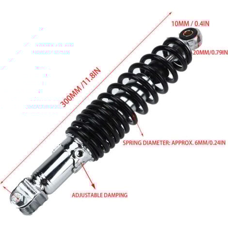 20 mm / 0,79 pouces Capacité de charge maximale: 1500 lb Application: pour le remplacement, la rénovation, la mise à niveau, la modification, la décoration, etc. 8 mm / 0,31 pouces Diamètre de printemps: env. Compatibilité universelle : avec un entraxe de trou de 220 mm pour une installation universelle, cet amortisseur arrière s'adapte à la plupart des vélos électriques, motos, VTT, scooters et vélos tout-terrain Démonte-ressorts universel, idéal pour tous les amortisseurs simples et les fourches de motos. 100 % made in Italy. Conçue et fabriquée en Conception : corps en alliage métallique et fabrication de précision de précision à haute performance de 8 mm de diamètre, avec des propriétés anti-usure, étanche, offrant une stabilité élevée et une durabilité. Outils d'Amortisseur Moto, Cross, Scooter, Quad pas cher - EMP Dimension optimisée: en alliage métallique et en acier à ressort, avec une longueur totale de 250 mm, un diamètre de trou 8 mm, un diamètre de ressort de 8 mm, une épaisseur de trou de 20 mm et une capacité de charge maximale de 1500 livres, adaptée à diverses applications. Remplacement idéal: Convient pour remplacer les amortisseurs anciens et endommagés sur les véhicules d'origine, ainsi que pour la modification, la décoration, la mise à niveau et d'autres applications de projet. Amortisseur Scooter électrique Suspension Amortisseurs 220mm Amortisseur Ressorts Suspension Gaz Arrière Azote Pour Chopper E-Bike Scooter Électrique ATV Quad Go Karts Amortisseur 220 Mm Ressort 8 Mm 8 mm / 0,31 pouces Épaisseur du trou de montage: env. 250 mm / 9,84 pouces Distance du trou de montage: env. 220 mm / 8,66 pouces Trou Diamètre intérieur: env.