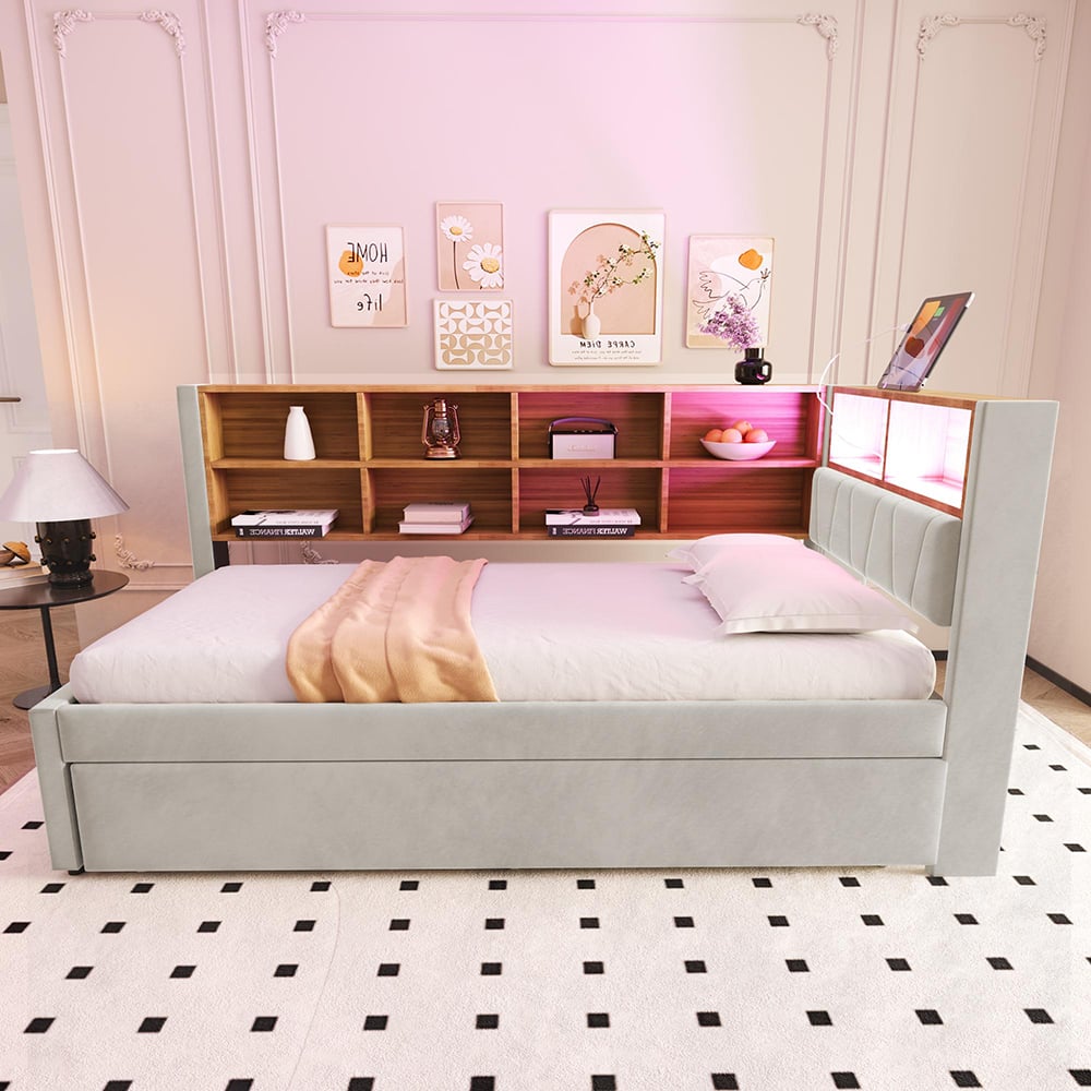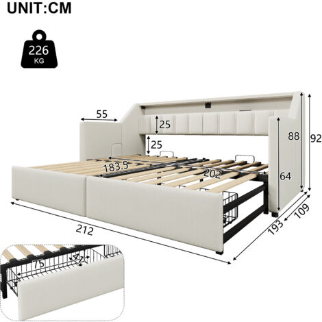 Lit Simple 90x200cm, Structure de lit Coffre avec rangement, Tête de lit avec LED intégrées et Canapé Lit Design Moderne Fonctionnel Achat YEHTOKHOME Canapé-lit 90x200cm Multifonctionnel Avec Deux Pas Cher Lit Simple Avec Rangement FACILE À ASSEMBLER : Ce produit est livré avec des instructions d'assemblage détaillées et des étapes d'installation claires pour un assemblage facile. DESIGN MULTIFONCTIONNEL : Ce canapé-lit est équipé de 2 ports USB et de 2 prises de chargement,vous pouvez charger vos téléphones portables,tablettes et autres appareils électroniques à tout moment,sans avoir à chercher des prises. En outre,ce canapé-lit est également doté de plusieurs compartiments de rangement, adaptés au rangement des téléphones portables,des décorations,des livres ou d'autres objets. La tête de lit intègre une enceinte Bluetooth multifonction avec deux mini-haut-parleurs, des ports de chargement USB-A et USB-C, ainsi qu'une veilleuse. Elle combine éclairage, chargement et lecture de musique, pour un confort optimal dans un intérieur moderne DESIGN CREATIF : Ce canapé-lit est équipé d'une lumière d'ambiance LED multicolore, vous pouvez ajuster la couleur de la lumière selon vos préférences et votre humeur, ajoutant une touche de romantisme à votre chambre à coucher. Qu'il s'agisse d'un style minimaliste moderne ou d'un style rustique confortable, il peut faire partie de votre décor et améliorer l'esthétique générale de votre espace. Équipé de plusieurs compartiments de rangement intégrés, ce canapé-lit permet de ranger des livres, des jouets, des télécommandes ou d'autres objets,offrant ainsi... Le choix de matériaux de haute qualité améliore non seulement la durabilité du produit,mais vous offre également une expérience fiable et à long terme. Que ce soit pour les loisirs ou le travail,vous pouvez toujours garder vos appareils électroniques complètement chargés et profiter d'une expérience de vie plus confortable.