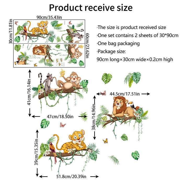 Décor Sécuritaire: Fabriqué en vinyle imperméable autoadhésif, encre et papier non toxiques, respectueux de l'environnement, sans odeur désagréable. Utilisez vos murs et nos stickers muraux animaux de la jungle comme outil d'apprentissage ! Chaque animal a son propre sticker que votre enfant peut décoller et coller au mur Ils peuvent ne pas adhérer aux surfaces très texturées, mais adhèrent aux murs légèrement texturés. Chaque taille de feuille: 30cm* 90cm, taille finale recommandée: 120* 57cm. Convient aux murs, portes, meubles, miroirs, télévisions et fenêtres. Décoller les autocollants un à un du papier support et les positionner en suivant la mini-image de référence. Autocollant Mural Polyvalent: Idéal pour décorer les espaces tels que chambre, salon, salle de bain, chambre d'enfant, salle de jeux, etc. Il peut être collé sur toutes les surfaces lisses propres, sèches et non texturées: murs, fenêtres, carreaux, meubles, miroirs et même vos réigérateurs Les stickers muraux endommageront-ils mon mur ? Oui, les stickers SHUCHING sont amovibles et sans danger pour la plupart des murs. Tanlaby Stickers Mural Animaux de la Jungle Autocollants Mural Animaux Arbre Forêt Stickers Stikers Murals Enfant Stickers Mural Animaux De La Jungle Autocollants Muraux Animaux Dessin Anime Stickers Muraux Elephant Singe Girafe Lion Pour Chambre De Bebe Pepiniere D Enfant Decoration Murale De La Maison Facile à Appliquer: Assurez-vous que la surface est lisse et sèche. Pour les retirer, décollez-les très lentement. Attendez 4 semaines de séchage pour les murs fraîchement peints. Que dois-je faire si le sticker mural commence à se décoller ? Si une partie d'un sticker mural commence à se décoller d'une surface, vous pouvez utiliser de la colle lavable, telle que de la colle en bâton, de la colle à papier peint ou de la colle, pour le recoller. Design Unique : L'autocollant mural SHUCHING est conçu par des illustrateurs, mettant animaux de la jungle.
