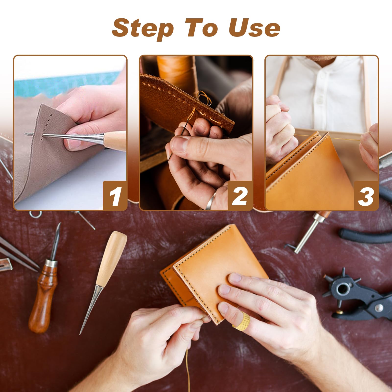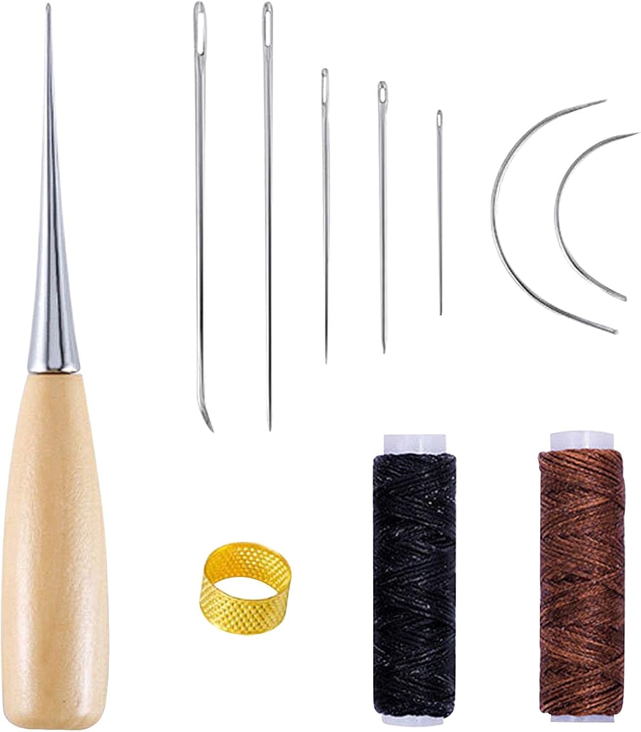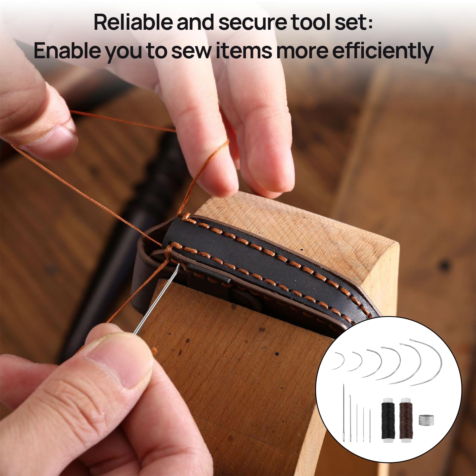 【Deux Rouleaux de Fil Ciré】Le fil en cuir épais et ciré a une forte résistance et une forte capacité de charge. Kit de Couture en Cuir Premium - Lot de 12 Aiguilles, Fil Ciré, Dé à Coudre et Matériau de qualité supérieure]: Nos aiguilles à coudre sont des aiguilles en acier qui sont durables ; le fil ciré est plus résistant que le fil ordinaire et a une forte résistance à l'usure, ce qui est mieux adapté pour réparer les bottes, les sacs en cuir et d'autres produits 【Cône Perforé en Cuir】La poignée du cône perforé est fabriquée en bois massif, la surface est lisse et offre une sensation de confort. 【Kit de Couture pour Cuir】Le kit de couture pour cuir contient 1 cône de perforation pratique, 7 aiguilles avec différentes fonctions, 1 rouleau de fil de cire noir, 1 rouleau de fil de cire marron, et 1 dé à coudre. Convient pour Toutes les Réparations]Les kits de réparation pour cuir sont adaptés pour la réparation des canapés, chaussures, tapis, sacs à main, sièges en cuir, portefeuilles, manteaux et autres vêtements en cuir. 11Pcs Kit de Aiguilles à Coudre Main, Aiguilles Couture Cuir... 【Aiguille à Coudre Complète】5 pièces de différents types d'aiguilles droites et 2 pièces d'aiguilles à coudre courbées, elles sont fabriquées en alliage de haute qualité, durables et peuvent répondre aux besoins de nombreuses méthodes de couture. L'ensemble comprend:1×cône de perforation pratique, 7×aiguilles avec différentes fonctions, 1×rouleau de fil de cire noir, 1×rouleau de fil de cire marron, et 1×dé à coudre. Aiguilles Couture Cuir Avec Fil AIEX 18 Pièces Outil Cuir Aiguilles à Coudre Pour Réparation De Cuir Kit Réparation Cuir 11 Pièces