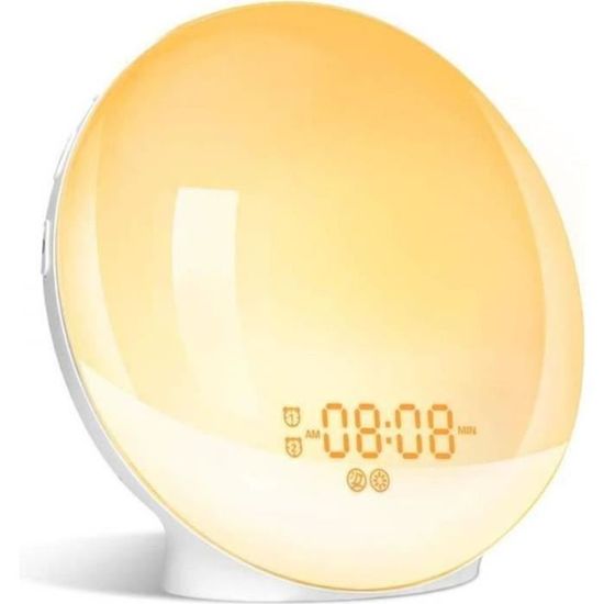 Radio Réveil Simulateur D'Aube Lampe Lorsque l'alarme sonne, il suffit de toucher l'anneau supérieur ou d'appuyer sur le bouton de molette pour bénéficier de 9 minutes de sommeil supplémentaires. Convivial et Pratique : Réglez et contrôlez facilement votre reveil lever de soleil grâce au bouton supérieur intuitif. Maintenez enfoncé pendant 3 secondes pour éteindre. Touchez n'importe quel point de l'anneau lumineux pour allumer ou changer de couleur. la lampe de réveil led de la nouvelle génération. elle vous guidera vers un réveil naturel et un sommeil doux et reposant. en vedette avec 20 réglages de luminosité différents, le réveil offre une lumière augmentant progressivement à partir de 10-60 min avant votre heure d'alarme programmée Grâce à son design de rouleau intuitif, nous avons simplifié au maximum l'opération. La veilleuse et le bruit blanc s'éteindront automatiquement à la fin. Réglez un minuteur de 10 à 480 minutes. Plus qu'un réveil, c'est une machine à sons. Une batterie intégrée mémorise vos réglages, garantissant que vos préférences sont enregistrées même en cas de coupure de courant. Réveillez-vous doucement, à votre manière, en vous sentant renouvelé. Ajustez votre veilleuse avec les boutons +/- dédiés. Lorsque l'alarme sonne, il s'illumine au niveau 3 pour afficher l'heure. Profitez de 10 bruits blancs et de 20 sons naturels intégrés, transformant votre espace en un havre de paix pour vous détendre et mieux dormir. Mode Aide au Sommeil Réconfortant : Utilisez le minuteur de sommeil pour créer l'ambiance idéale pour votre coucher. Personnalisez votre environnement auditif avec 32 niveaux de volume réglables pour une ambiance parfaite, aidant à masquer les bruits perturbateurs et à favoriser un meilleur sommeil Écran éteint pour les utilisateurs sensibles à la lumière. Ce réveil simulateur d'aube s'illumine progressivement pendant jusqu'à 60 minutes, accompagné de sons naturels apaisants, vous permettant de vous réveiller en douceur. En plus de la simulation de lever de soleil, cette lampe de nuit en forme d'anneau dispose de 12 modes : couleur fixe, dégradé, lumière respirante, dégradé circulaire et lumières de poursuite. LIORQUE Réveil Lumineux Simulateur D'Aube, Reveil Simulateur D Aube Reveil Simulateur D Aube Sur Lampe De Chevet Led Lampe De Reveil Avec 30 Sons Pour Dormir 13 Niveaux De Luminosite Adaptateur Inclus A6771353 B6f4 4640 B4c4 99bc9f7071e3 Design en Bois Élégant et Affichage du Temps Doux : Doté d'une texture en bois de qualité, l'affichage LED de ce reveil lumineux simulateur d'aube est clair et brille doucement à travers le grain du bois, garantissant un effet non éblouissant. Réveillez-vous en Douceur, Dormez Paisiblement Profitez d'un réveil naturel et de nuits réparatrices avec cet appareil tout-en-un. La lampe de chevet LED LIORQUE offre un réveil doux grâce à sa fonction simulateur d'aube. Elle s'illumine progressivement pendant 60 minutes avec des sons naturels apaisants 30 Sons de Bruit Blanc Apaisants : Glissez-vous dans un sommeil paisible avec 30 options sonores diverses, comprenant 20 mélodies naturelles et 10 choix de bruit blanc.