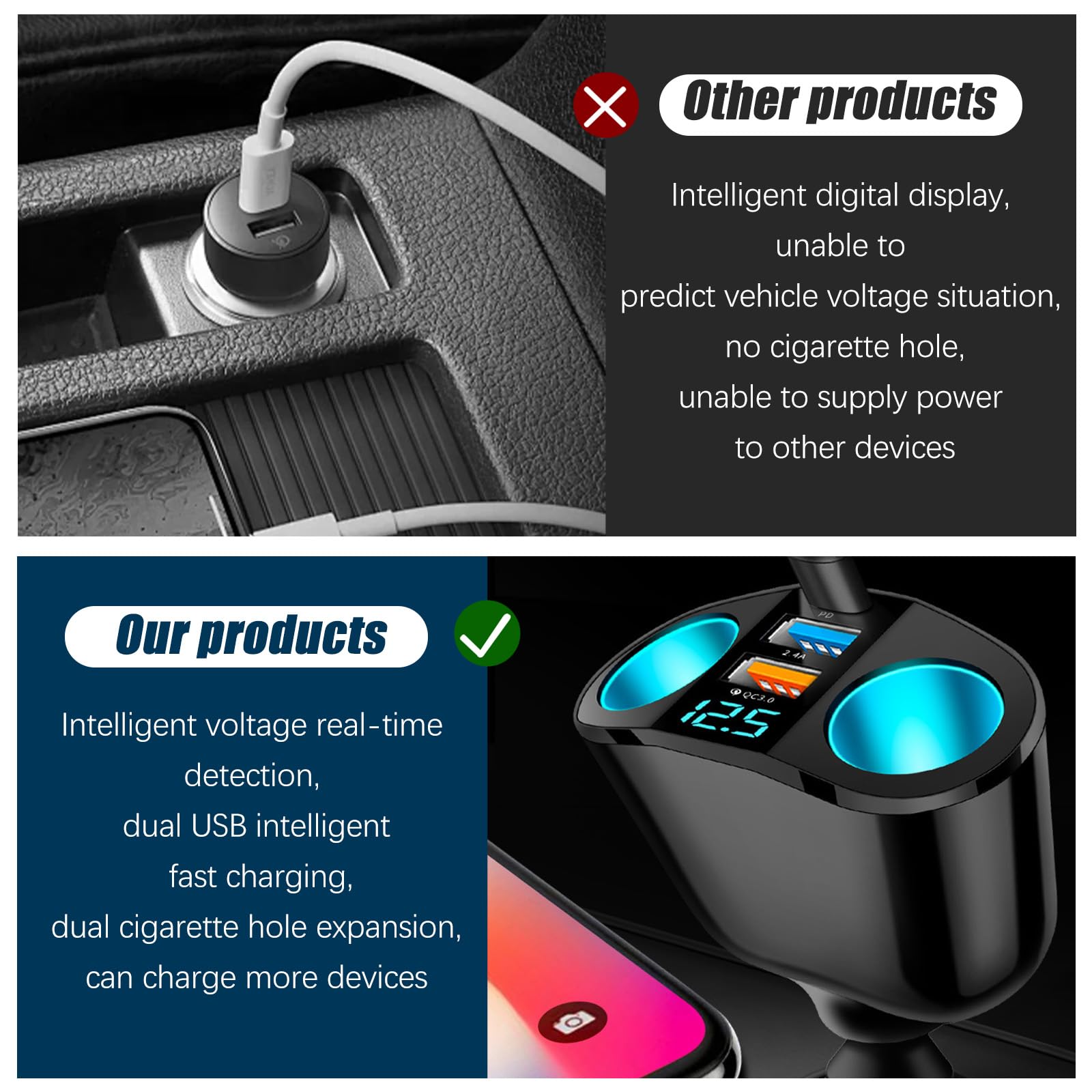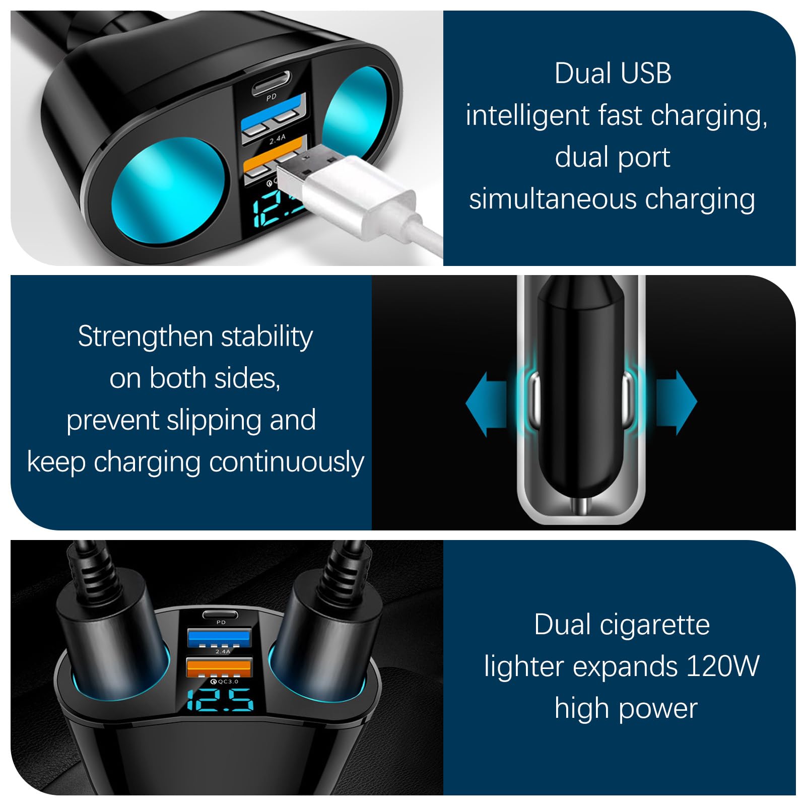 Entrée : DC 12 V-24 V, convient à tous les types de véhicules. Achetez SUNNIFLY Chargeur Voiture Multifonction, Double Allume-cigare 2 USB PD Type-C, Affichage LED, Charge Rapide QC3.0 pour iPhone/Android, Compatible avec Véhicules 12V / 24V Découvrez ce chargeur de voiture multifonctionnel qui donnera un nouvel élan à votre vie mobile ! LARGE COMPATIBILITÉ : Avec une puissance de 120 W, ce distributeur pour allume-cigare peut être connecté à une large gamme d'accessoires automobiles et est compatible avec 95 % des véhicules sur le marché. Vous pouvez l'utiliser confortablement grâce à sa conception réglable à 360° et à son arbre allongé. MATÉRIAU DE HAUTE QUALITÉ : Ce distributeur allume-cigare est équipé d'une puce intelligente de haute qualité, qui fournit de multiples protections pour votre sécurité de charge et réduit les problèmes tels que les courts-circuits ou les surcharges. Il protège également votre chargeur de la surchauffe, tandis que la coque ABS ignifuge est robuste et durable. Ventilateur électrique,12v 360 degrés rotatif 2 vitesses Ajustable... Cet adaptateur allume-cigare de haute qualité est la solution parfaite pour charger vos appareils pendant que vous conduisez. Chargeur Prise Allume Cigare 2 ports USB2 1 port USB-C 35W + 3 Cables Lightning Blanc Pour iPhone 8/8 Plus/7/7+/5/SE-visiodirect- - Téléphonie Allume Cigare Usb C Rallonge Allume Cigare Adaptateur Allume-Cigare 4 Prises + 2 USB - Chargeur Voiture 12V/24V 120W Accessoire Auto Recharge Téléphone GPS Accessoire Auto Recharge Multiple Affichage intelligent de la tension : le distributeur pour allume-cigare est doté d'un affichage intelligent de la tension qui vous permet de surveiller la tension électrique de votre véhicule en temps réel. Profitez de la liberté d'utiliser plusieurs appareils en même temps et restez connecté à tout moment, où que vous soyez. Idéal pour les voyageurs longue distance, les navetteurs et les grands voyageurs d'affaires. Il suffit de brancher le chargeur sur l'allume-cigare de votre voiture pour commencer à le charger. Spécifications du produit Nom : Chargeur de voiture multifonction Matériau du boîtier : ABS ignifuge Dimensions : 126 x 75 x 35 mm., Poids : 63 grammes.