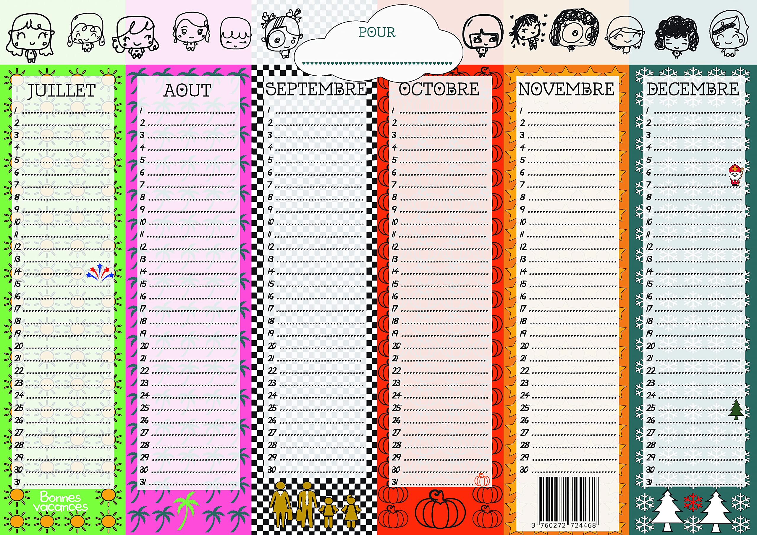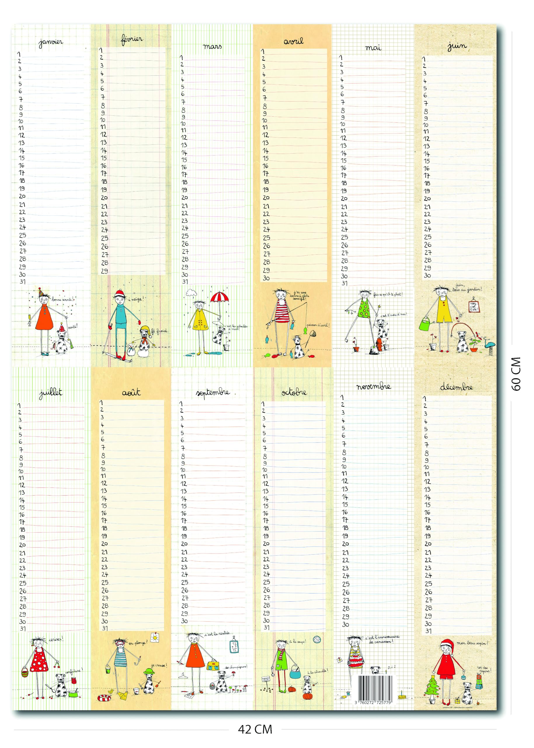 Mon calendrier d'anniversaires: L'agenda perpétuel idéal pour noter Design joyeux et intemporel Réalisé par une illustratrice talentueuse ✔ Pratique et esthétique : Notez tous vos anniversaires, fêtes et moments précieux pour les avoir toujours sous les yeux. 🎁 Idée cadeau parfaite : Original, pratique et durable, il fera plaisir à tous ceux qui aiment associer l’utile au beau. Multicolore, inscriptible et durable, ce calendrier convient aussi bien aux adultes qu’aux enfants. S’installe en quelques secondes avec cadre magnétique Grâce à son cadre magnétique et adhésif, il se fixe facilement sur toutes les surfaces (mur, frigo, porte) sans clou ni vis. Imprimé sur papier numérique mat 200 g/m² · Disponible en format A4 · 13 pages entièrement personnalisables · Aucune année ni jour ne sont mentionnés · Seuls les... Ce calendrier sans année, au format A3 recto verso, est conçu pour vous accompagner toute votre vie. Aidez-vous, vos amis et votre famille à visualiser les dates clés de l'année avec ce calendrier de 365 jours. Nous sommes tous tellement pris dans la vie quotidienne qu'il devient difficile de se souvenir des dates récurrentes les plus importantes. Utilisable à vie : Pas de dates ou d’années, il reste valide année après année. 👉 Offrez-vous un calendrier qui traverse le temps et sublime vos souvenirs ! Vous pouvez même l’offrir déjà rempli, un geste à la fois attentionné et personnalisé qui fera mouche à coup sûr ! Calendrier Perpétuel Joyeux Anniversaires Cadre Magnétique Adhésif Ne laissez plus passer aucune date importante avec le calendrier perpétuel Joyeux Anniversaires ! La grille de ce calendrier de 365 jours vous permettra une visibilité globale de l'année et des événements importants à ne pas oublier. Inscriptible : Notez directement dessus anniversaires, fêtes, ou dates importantes. Chaque illustration respire la légèreté, l’intemporalité et la créativité. Illustré par Filf, avec des dessins d’enfant pleins de fraîcheur et de poésie, il apporte une touche joyeuse et colorée à votre maison. Affiché à la maison ou au bureau, il servira de rappel tout au long de l'année. Découvrez notre calendrier perpétuel, un indispensable plein de charme, pensé pour durer et embellir votre quotidien. Cadre magnétique adhésif souple : Installez-le facilement sur n’importe quel mur sans clou ni outil. Calendrier The Calendrier Perpétuel | Poster Dates Importantes & Anniversaires Calendrier Anniversaire à Imprimer Gratuit ✔ Format généreux (60 x 42 cm) : Une belle affiche qui attire le regard et trouve facilement sa place dans votre intérieur. Parfait pour noter les anniversaires, fêtes et moments spéciaux, il combine utilité et décoration grâce à ses illustrations colorées et intemporelles. Calendrier perpetuel Anniversaires & dates importantes | Grand poster souple A2 sans année | Inscriptible Multicolore 3,0 (4) 990 💡 Ce calendrier n’est pas seulement utile : c’est aussi une œuvre décorative !