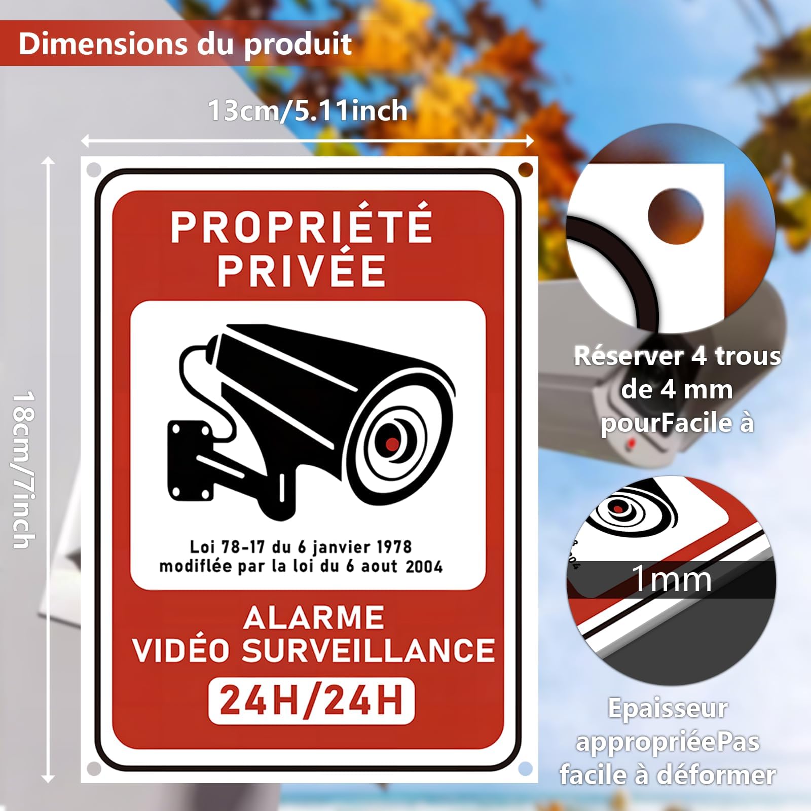 MATÉRIAU DURABLE: Fabriqué en PVC rigide résistant aux intempéries, idéal pour une utilisation en intérieur comme en extérieur PARFAIT POUR UN MONTAGE SANS PROBLÈME Nos panneaux sont également idéaux pour toute propriété, à l'extérieur ou à l'intérieur. INSTALLATION FACILE: Montage adhésif sans perçage, livré avec 4 colliers de fixation pour une installation rapide Petit panneau lumineux intérieur | FAMA TRAFFIC CONFORMITÉ LÉGALE: Référence à la loi 78-17 du 6 janvier 1978 modifiée, indiquant une surveillance vidéo 24h/24 Découvrez nos panneaux de chantier avec les consignes de sécurité à respecter. En PVC expansé, plusieurs dimensions Livraison rapide et paiement sécurisé Plaque Video Surveillance Extérieure Kinoco Lot De 1 18x13 Cm Panneau Avertissement Surveillance Vidéo "Propriété Privée" En PVC Rigide Adhésif + 4 Colliers | Intérieur/Extérieur Résistant | Installation Rapide Sans Perçage Signalétique Caméra PVC Ce panneau indique les principales consignes à respecter sur le chantier afin d'éviter un accident. Informe sur l'accès interdit au public, l'interdiction de stationner, quels sont l es Epi obligatoires pour les travailleurs ainsi les dangers existants