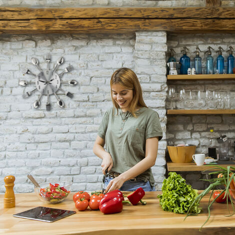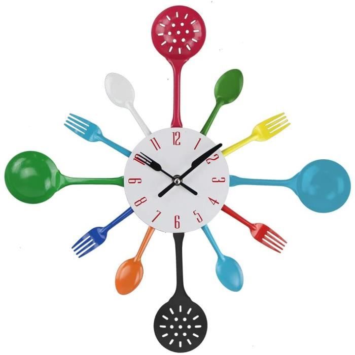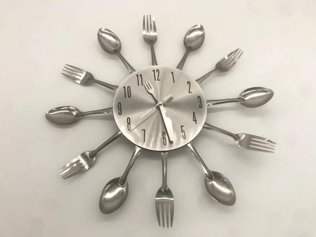 Drôle: Horloge murale originale en forme de couverts - 12 cuillères et fourchettes marquent heures Dans la cuisine et la salle à manger en particulier, l'horloge est une superbe décoration murale, mais elle attire aussi le regard dans le restaurant. L'ensemble de couverts portable multifonctions pour le camping en plein air permet d' conomiser de l'espace et facilite le transport Les heures complètes sont marquées par des cuillères, des louches et des fourchettes disposées autour du cadran. - Idéal pour la cuisine, la salle à manger, le restaurant etc. Fonctionne à piles: Horloge murale de cuisine nécessite une pile AA pour fonctionner (non incluse Rond: Horloge analogue pour le mur avec diamètre d’env. jeux de (cuilleres+fourchettes+couteaux 31 cm - Ne pas perdre l’heure de vue Décoratif: L'horloge à couverts attire l'attention dans la cuisine, la salle à manger ou restaurant Horloge Cuisine Design Cuillères Fourchettes Pile AA Nécessaire Horloge Murale Relaxdays Couverts - Cuillères Fourchettes - 31cm Métal Argenté - Pile AA Horloge Couverts Argenté Horloge De Cuisine En Forme De Couverts - Fonctionnement silencieux sans bruits de tic-tac gênants- Nécessite une pile AA pour fonctionner (non incluse)Contenu de la livraison- 1x Horloge murale de cuisine- Livrée sans objet de décoration et sans piles Avec cette pendule à couverts, vous avez une attraction fantaisiste sur votre mur et vous gardez toujours l'heure exacte en vue. À cette fin, l'horloge originale de dîner est équipée d'une aiguille des minutes et des heures en forme de petite fourchette et d'un couteau.