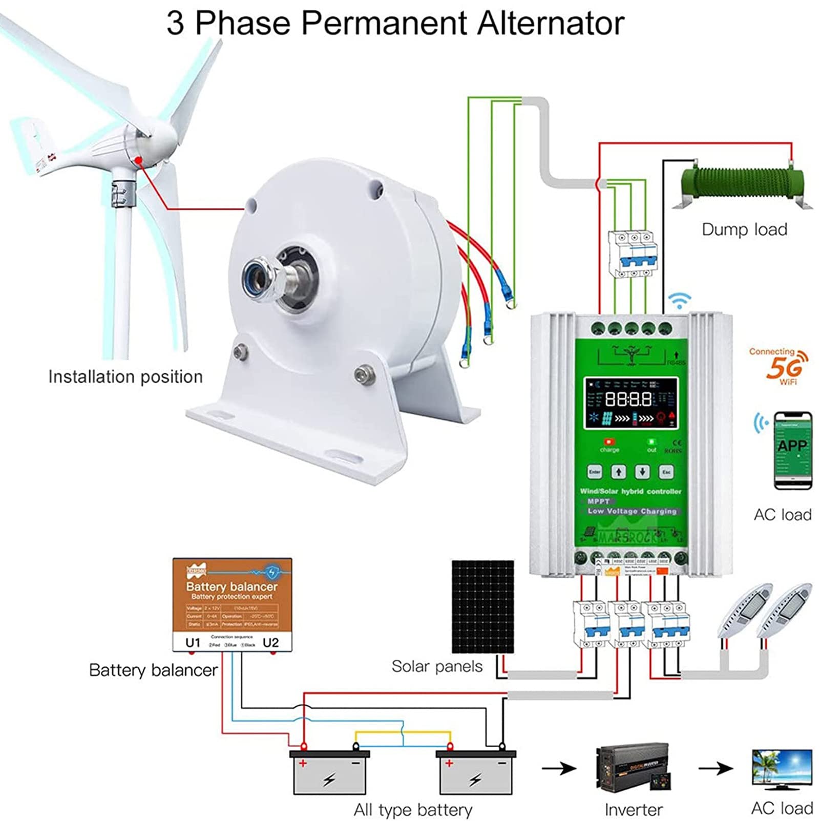 Avec les lumières LED, vous n'avez pas besoin de connecter quoi que ce soit. Moteur électrique sans balais à monter soi-même : ce générateur d'éolienne électrique triphasé dispose d'un moteur sans balais, permettant une performance stable et une grande fiabilité dans les expériences de production d'énergie * Fil noir, le pôle négatif de toutes les alimentations est connecté ensemble. Applications : parfait pour les projets d'énergie éolienne, ce générateur peut être utilisé dans une variété de paramètres, des systèmes d'énergie renouvelable à domicile aux démonstrations éducatives sur l'énergie durable. Câblage convivial : le générateur dispose d'un système de câblage simple avec des lignes à code couleur connectant les fils rouge et noir pour la génération d'énergie, facile à utiliser pour les débutants et les utilisateurs expérimentés. La génération d'énergie est la génération de courant continu. Paramètres de production d'énergie approximatifs : 120 tr/min : 9 V., 240 tr/min : 18 V., 480 tr/min : 36 V., 960 tr/min : 72 V. Générateur à aimant Permanent 2kw 3kw 5kw 6kw 7kw 12V 24V 48V, ensemble de générateur d'énergie gratuit avec moteur à courant continu, Turbine éolienne Maglev à monter soi-même 5000W * Fil blanc, tension de fonctionnement, DC14-16V * Ligne jaune, contrôle de la vitesse, régulation de la vitesse 0-6,5 VPWM, plus la tension est faible. FLTXNY POWER Turbine éolienne horizontale 8000 W 220 V AC 8 kW 3 pales 2,4 Générateur Courant Continu 9-72V Générateur D'éolienne électrique Triphasé, Moteur Sans Balais Générateur Hydraulique Manuel Avec d'autres, vous devez rectifier et stabiliser la tension. * [Note] : ce moteur est un moteur de 220 V. Il ne génère pas de courant 220 V. Il est plus simple de générer de l'énergie: connectez les fils rouge et noir. La rotation positive et négative peut générer de l'énergie.