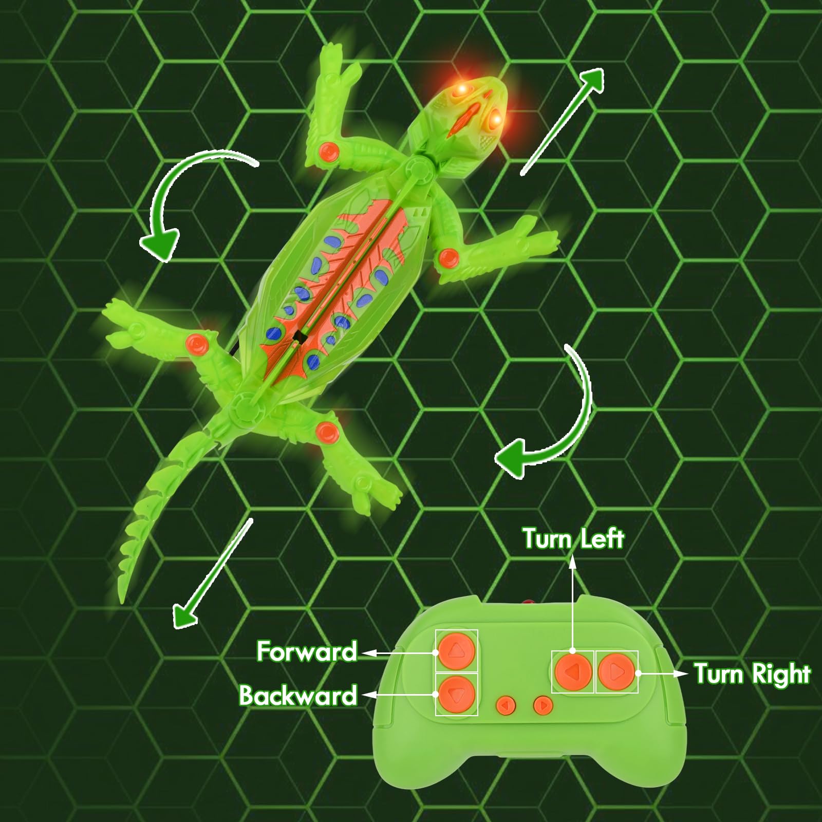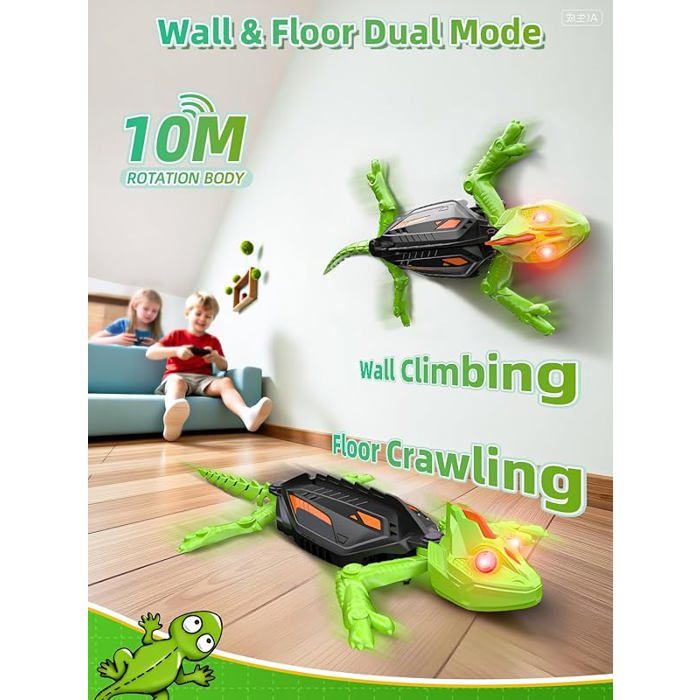 Description du produit 1 pièce Avertissement De Sûreté À utiliser uniquement sous la surveillance directe d'un adulte Rechargeable Caméléon Télécommandé, Gecko Radiocommandé avec Yeux LED, Lézard Robot Jouet, Cadeau Anniversaire pour Enfant Garçons Filles 3 4 5 6 7 8 Ans [Version Améliorée La rotation à 360° permet à Caméléon Grimpeur d'exécuter des manœuvres impressionnantes sur les murs et même les plafonds., Important Parfait comme cadeau d'anniversaire, surprise de Noël ou récompense pour les jeunes explorateurs. Remarque : le film protecteur au bas est crucial pour l'adhérence - ne pas le retirer ! Geko Lezard Radiocommandé Lézard Télécommandé - Robot Grimpeur Mural Lezard Télécommandé Les yeux brillants rendent Lézard Robot Télécommandé Rechargeable particulièrement remarquable - idéal pour des explorations nocturnes dans la chambre d'enfants. 【Contenu du colis】 1x Caméléon Grimpeur, 1x télécommande, 1x câble de chargement USB, 1x manuel d'utilisation. La télécommande nécessite 2x piles AA (non incluses). 【Distance de télécommande de 10 mètres】 La télécommande ergonomique permet un contrôle intuitif de Caméléon Grimpeur avec une portée allant jusqu'à 8 mètres. Images de Lezard Robotique Metallique - Téléchargement gratuit sur eepik 【Cadeau à valeur éducative】 Lézard Robot Télécommandé Rechargeable stimule ludiquement la coordination main-œil et la curiosité des enfants dès 3 ans. Le Gecko Robot qui Défie la Gravité ! Imaginez la surprise de vos enfants en voyant ce lézard électrique grimper sur les murs et même au plafond ! Ce jouet télécommandé innovant offre une expérience de jeu unique et captivante
