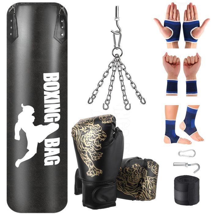 Système anti-rotation à 360° et stabilisation croisée : le sac de frappe suspendu vide convainc par sa protection innovante contre la rotation à 360° et son système de sangles croisées au fond pour un maintien maximal. vous propose plusieurs modèles de sacs de boxe, à choisir en fonction de votre budget, de votre usage et de l’espace dont vous disposez pour l’installer Kit de sport de combat professionnel pour un entraînement intensif à la maison Notre sac de frappe suspendu vide de qualité supérieure offre tout ce dont vous avez besoin pour un entraînement complet des arts martiaux. La suspension brevetée empêche la torsion gênante - Ainsi, votre ensemble de sacs de frappe lourds reste toujours parfaitement aligné pendant l'entraînement Construction robuste pour un entraînement intensif : le sac de frappe suspendu de qualité supérieure est en nylon résistant avec double couture renforcée. Tout est prêt à l'emploi : votre sac de frappe pour la maison est livré avec tout pour un entraînement sûr Le sac de frappe lourd contient en outre des gants de boxe de qualité supérieure, des bandages de poignet pratiques, un équipement de protection bleu et une suspension robuste – Prêt à l'emploi. Cintre pour sac de boxe, support pour sac lourd,Crochet de poutre en bois à montage Muay Thai MMA karaté., ✓ Fitness général. Le sac de frappe de 120 cm de long et 35 cm d'épaisseur avec système anti-rotation innovant à 360° et stabilisation croisée garantit une sensation d'entraînement réaliste. Fabriqué en nylon durable avec double renforcement des coutures, ce sac de sable résiste aux coups et coups de pied les plus violents., Parfait pour : ✓ Boxe. Sac Boxe NON REMPLIR : La hauteur de 4 pi est de taille parfaite pour le poinçonnage. Fait de cuir PU de haute qualité et de sangles renforcées, doté de vis... Sac Lourd Anti-rotation 360 Punching Ball Enfants Sac De Boxe Suspendu Sfeexun - Kit Avec Gants, Chaîne, Crochet Plafond, Pour MMA, Kickboxing, Fitness Sac Frappe Suspendu MMA Sac De Frappe Avec Gants Et Bandes Le rembourrage spécial du sac de boxe pour la maison imite les contours humains pour une expérience d'entraînement authentique, tandis que le système d'absorption des chocs protège vos articulations.