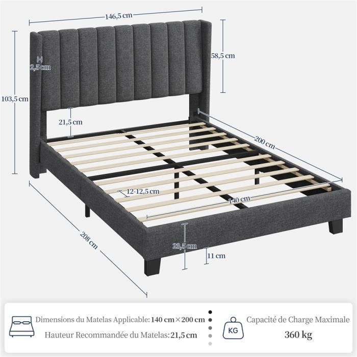 1 × Cadre de Lit 1 × Notice de Montage Avertissement De Sûreté / Si vous ne recevez qu'un seul colis, veuillez patienter 2 à 3 jours. Composé d'un cadre en métal/bois solide et de tissu à l'effet lin, ce lit design est assez résistant pour supporter une charge élevée, ajoutant une touche contemporaine à votre intérieur. Ainsi, vous pouvez créer un espace de détente personnalisé et cosy ✨Tête de lit modulable: Avec le cadre de lit en bois, vous pouvez régler la hauteur de la tête de lit capitonnée selon votre confort. Lit Rembourré Charge 360 Kg Rangement Tiroirs Lit Double 160x200 Yaheetech Avec Tiroirs - Rangement Intégré Et Tête De Lit Réglable Noir Lit Capitonné Similicuir Lit Parapluie ✨Lit au charme intemporel: Ce lit design au revêtement élégant et au capitonnage carré apporte une touche de modernité et de raffinement à votre chambre à coucher. Deux options sont possibles : 106 cm ou 116 cm. Un modèle facile à monter, avec une notice illustrée et des pièces numérotées. Le support central répartit le poids de manière équilibrée sur le lit, vous offrant une surface de couchage agréable et stable Lit capitonné adulte 140 x 200 cm avec 4 tiroirs - USB LEDs - tissu... Son délai d'arrivée pourrait varier en fonction de la situation logistique réelle. Transformez votre espace de sommeil en un refuge stylé et cosy. ✨Construction solide: Notre lit avec tête de lit est doté d'un cadre métallique solide et de 10 lattes de renfort. La tête de lit capitonné en treillis, remplie de mousse, offre un confort exceptionnel pour votre corps. Yaheetech Cadre de Lit Double 160x200 cm avec Tête de Lit Réglable en Hauteur, Tiroirs et Sommier à Lattes, Noir Confort optimal : Recouvert de similicuir soigné, rembourré de mousse dense, le cadre de lit en bois s'avère doux au toucher, offrant une détente agréable Yaheetech Cadre de Lit en Métal avec Tête de Lit Déco Effet Couronne ✨Lattes de bois résistantes: Ce cadre de lit 160 × 200 est doté de dix lattes de bois robustes, espacées pour un soutien optimal et une ventilation adéquate à votre matelas.
