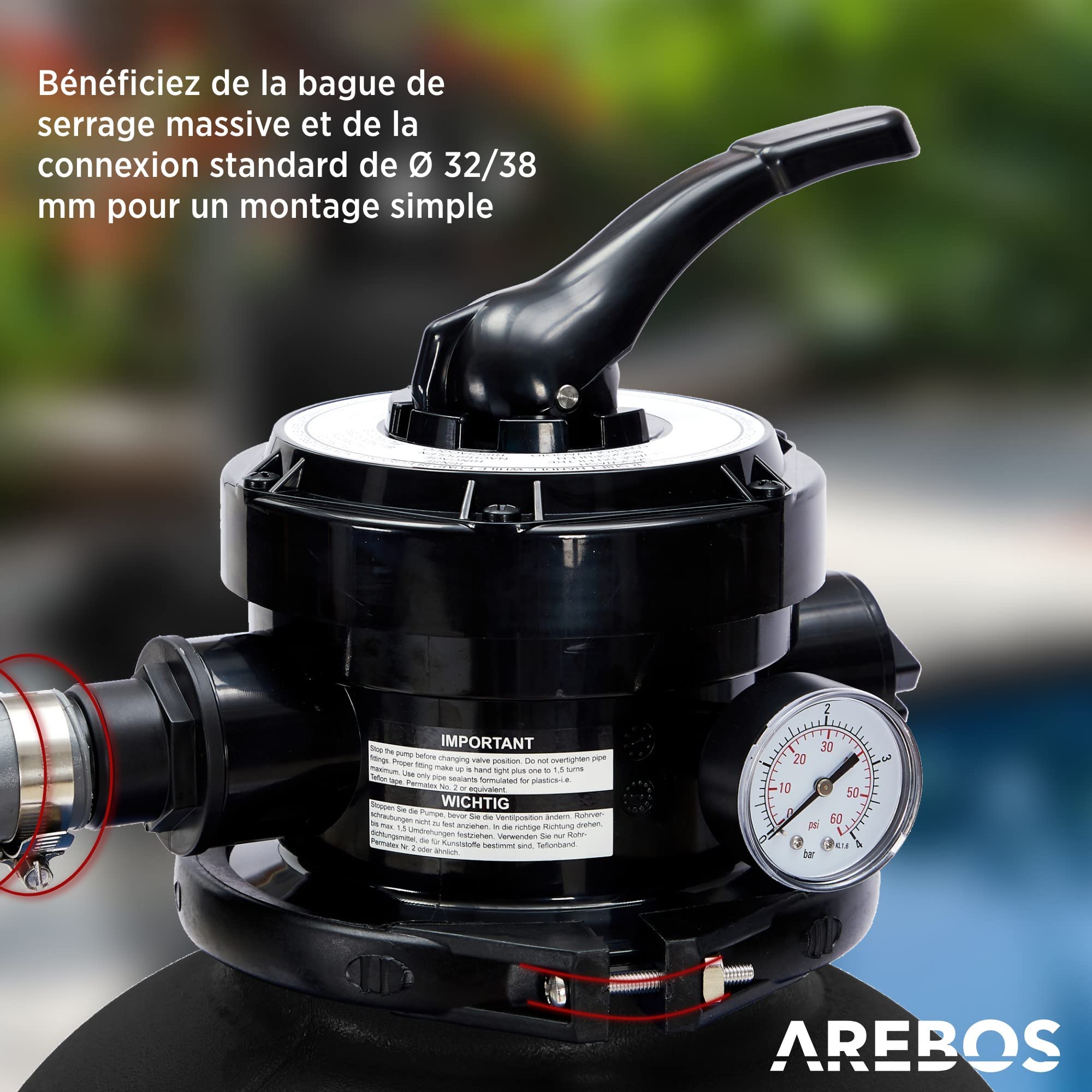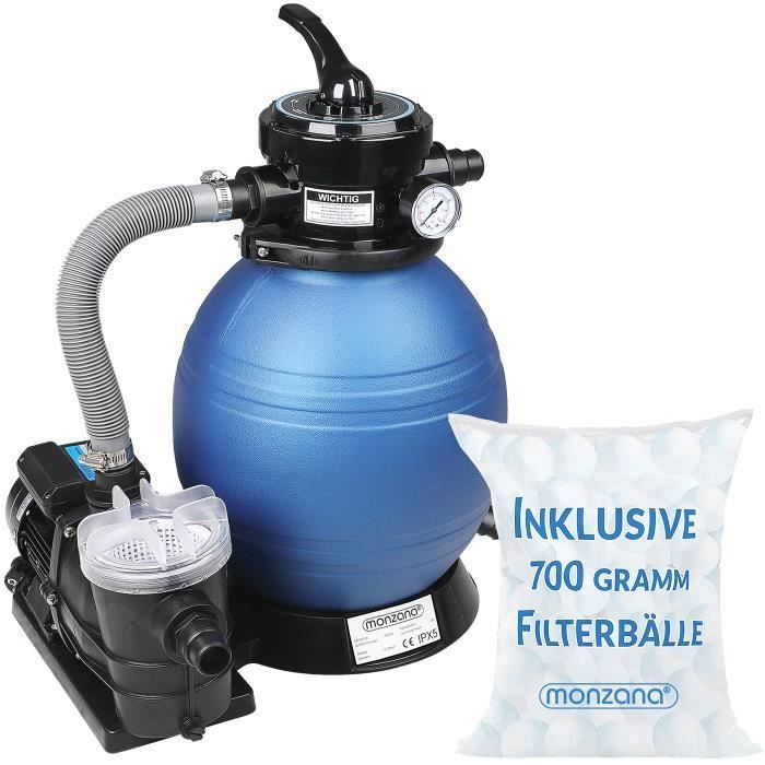 Cela signifie que vous pourrez connecter pratiquement toutes les piscines disponibles dans le commerce. Contenu de la livraison : [Comprend un affichage de la pression] Le manomètre intégré vous permet de vérifier à tout moment la pression dans le système de filtration de la piscine. Informations utiles Température de l'eau appropriée : 0 - 45 °C Contrôle de la pression Le manomètre intégré à la vanne à 4 voies indique toujours uniquement la pression de fonctionnement réelle de votre système de filtre à sable. Ce système de filtration convient à pratiquement toutes les piscines disponibles dans le commerce jusqu'à une taille maximale d'environ 40 m³. Malgré ses excellentes performances de filtration, le système de filtration à sable impressionne par sa faible consommation d'énergie. Pendant le nettoyage, la pompe de votre piscine pompe jusqu'à 10 200 litres d'eau par heure dans l'unité de filtration, où elle est nettoyée puis pompée dans la piscine. [Données techniques de la pompe de filtration] Matériau : boîtier robuste et résistant à la corrosion en plastique et métal | Alimentation : 220-240 V~, 50 Hz | Matériau du filtre : 20 kg de sable max ou billes filtrantes (1400 g inclus) | Granulométrie recommandée : Ø 0,4 ~ 0,8 mm | Dimensions du système de filtration de piscine (LxlxH) : 458 x 298 x 621 cm. Vanne à 4 voies : rétrolavage, rinçage, filtrage du bassin, hiver (mode de repos) L'eau est conduite à travers le média filtrant, pendant lequel la saleté adhère au filtre. Alternativement, vous pouvez utiliser le système de filtration avec les billes filtrantes incluses dans la livraison. Les billes sont lavables, vous pouvez donc les réutiliser plusieurs fois. Votre avantage : pas de travail acharné, nettoyage facile, respectueux de l'environnement. La pompe de piscine avec système de filtration à sable nettoie et filtre l'eau de votre piscine pour une expérience sans souci dans de l'eau fraîche. Système de Filtre à Sable AREBOS - Noir - 400W - 10.200 L/h - Capacité du réservoir jusqu'à 20 kg de sable - Vanne à 4 Voies avec poignée - Avec manomètre Le système de filtration à sable fonctionne très simplement. Ils convainquent également par leur faible poids, ce qui élimine le besoin de traîner des sacs lourds. Pour l'installation initiale, vous aurez besoin de 20 kg de sable de quartz filtrant avec une granulométrie de 0,4 à 0,8 mm. Le fonctionnement de la vanne est plus simple et plus pratique que dans les systèmes utilisant des filtres à cartouche. Chauffer, sécuriser, traiter... équipements de piscine essentiels ou de confort, Carré Bleu propose des solutions adaptées à chaque projet Compatible avec la plupart des piscines hors-sol, Facile à utiliser Grâce à la longue durée de vie des billes filtrantes, vous économiserez de l'argent et de l'énergie. Aperçu des points forts Pompe puissante avec une capacité de pompage maximale de 10200 L/h Remarque : les boules filtrantes de 1400 g sont incluses dans la livraison ! Capacité du réservoir jusqu'à 20 kg de sable Bonne qualité de l'eau Assurez-vous d'utiliser un système de filtration pour assurer une bonne qualité de l'eau. La cuve du filtre est reliée à la vanne à 4 voies par une bague de serrage solide et de qualité testée. Dimensions : 298 x 458 x 621 mm , Poids : 11kg Ils sont également beaucoup plus légers que les autres médias filtrants, et les billes filtrantes sont faciles à manipuler et ont une capacité de collecte élevée. Filtre Piscine Hors Sol Pompe Filtre à Sable 10.200 L/h 400W 1000g Boules De Filtration Raccord 2en1 32-38mm Métal Système Filtre à Sable Vanne 7 Voies Filtre Sable 20 Kg Capacité Comprend des boules filtrantes de 1400 g L'un des plus grands avantages est le matériau spécial utilisé. Après cela, l'eau propre est pompée dans la piscine. Connexion standard Le modèle de système de filtration à sable AREBOS dispose en standard de raccords pour tuyaux de piscine d'un diamètre compris entre Ø 32 et 38 mm. Filtre Sable Verre Boules Pompe Filtre à Sable Monzana MZPP100 - 5000l/h - 100W - Vanne 7 Voies - Pour Piscine Jusqu'à 15m³ Filtration 5000l/h Monzana