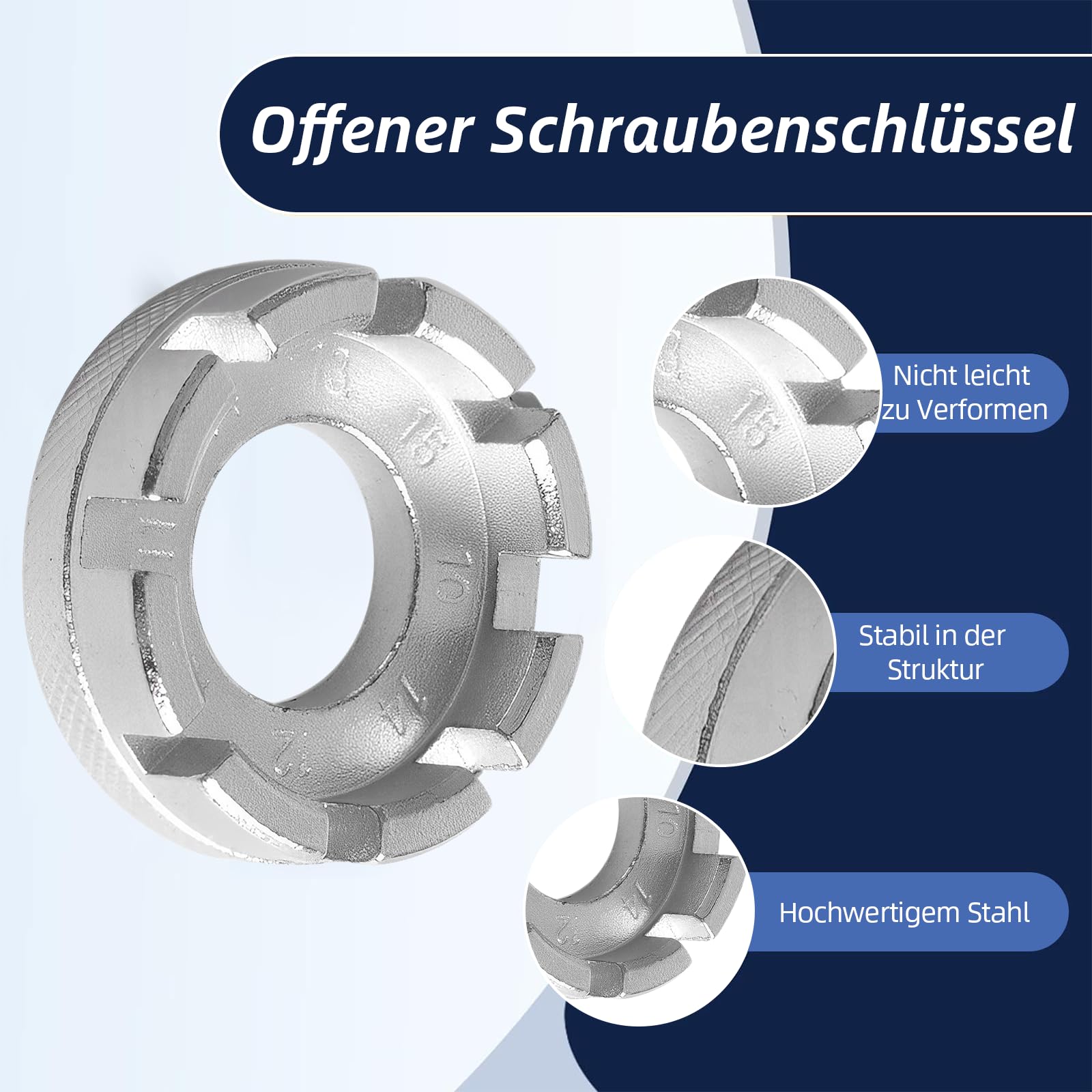 OUTIL DE CORRECTION de serrage cl rayons portable 3,2/3,3/3,5 mm 44,3 x Clé Multifonction Acier Outil à Rayons De Vélo Clé à Rayons De Vélo 6 En 1 Pour Régler Et Clé Ronde Diamètre 39mm Facile à utiliser: facile à utiliser, peut être fait d'une seule main, la surface est ronde et lisse pour éviter de rayer la peau, aucune bavure ne blessera l'écrou de rayon Clé plate pour vélo Caractéristiques techniques : Spezifikation Material: Acier au carbone au chrome-molybdène Couleur : noir Couleur : argenté Clé ronde : Diamètre : 39 mm - Hauteur : environ 11 mm Contenu de l'emballage 1 clé à rayons de vélo ronde Clé à rayons vélo Un outil indispensable pour les amateurs de vélo, rond et lisse, l'utilisation ne blesse pas la main, pas de bavure ne blesse pas le mamelon de rayon. Il est utilisé pour régler le serrage des rayons de vélo ou des rayons de véhicules électriques pour corriger et éviter la déformation des roues. C'est un outil indispensable pour les amateurs de vélo Outil pratique : outil indispensable pour corriger le réglage et le serrage des jantes à rayons de vélo et apporte une solidité et un soutien supplémentaires lors de la rotation de la roue. CLÉ DE SERRAGE universelle 6 en 1 rayons outil de serrage pour... Fonction principale : outil parfait pour ajuster la force des rayons de vélo ou des rayons de vélo électrique afin de corriger et prévenir la déformation des roues. Outil universel Le kit de clés à rayons de vélo contient de nombreuses tailles courantes et la clé à rayons ronde s'adapte aux capuchons de rayons de 10/11/12/13/14/15 g, numéros estampés