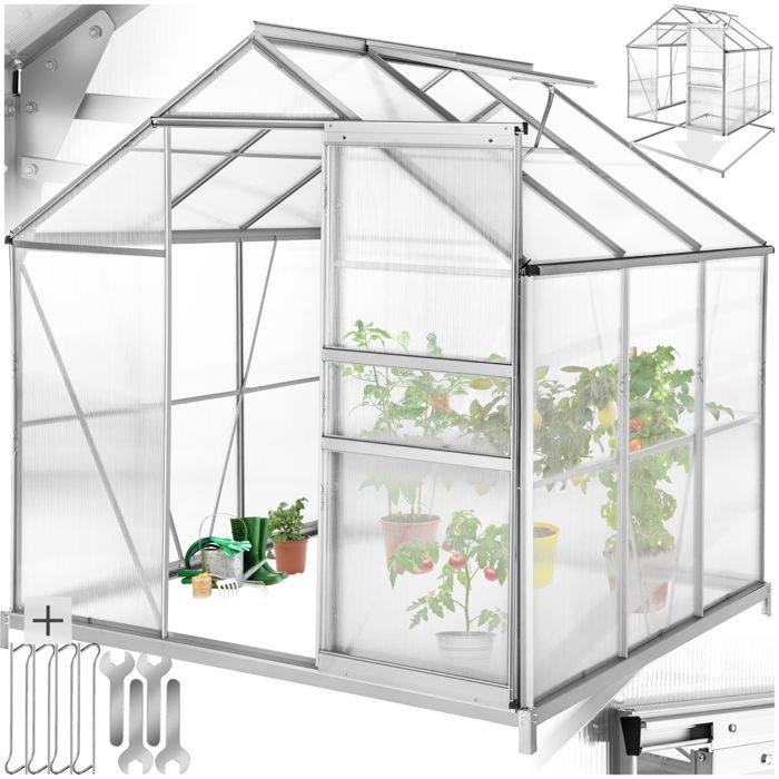 Contenu de l'emballage : 1 serre. Cette serre de haute qualité avec fondation de tectake convainc par sa fabrication solide et sa construction bien pensée – le complément parfait pour votre jardin.La structure robuste en aluminium est extrêmement résistante à la corrosion et aux conditions météorologiques changeantes Description du produit : Protégez vos plantes avec cette serre robuste qui offre à la fois stabilité et passage de lumière optimal. Le rail assure un fonctionnement fluide pendant des années. Accès pratique - Porte coulissante fonctionnelle : la porte robuste avec serrure offre non seulement une protection, mais aussi un accès facile pour prendre soin de vos plantes. 1 kit d'accessoires d'installation. Isolation fiable contre le froid et la chaleur : les panneaux de polycarbonate de 580 g/m² créent une température intérieure stable, protègent contre les changements climatiques extrêmes et améliorent le microclimat à l'intérieur de la serre. Construction durable pour toutes les saisons : cette serre combine des plaques à double paroi de 4 mm d'épaisseur avec un cadre en aluminium robuste pour... Avec un système de ventilation pratique et une porte coulissante durable, c'est la solution parfaite pour tout projet de jardin. Serre de jardin en aluminium laqué, modèle SUPRA - La Bonne Graine Serre Polycarbonate 4 Mm Serre De Jardin En Aluminium Et Polycarbonate + Fondation 370 X 190 X 195 Cm Serre Porte Coulissante Fenêtre Toit 1 manuel d'installation (français non garanti). Principales caractéristiques : Construction robuste : panneaux en polycarbonate de 4 mm d'épaisseur et cadre en aluminium garantissent durabilité et protection contre toutes les conditions météorologiques. Ventilation efficace : la fenêtre de toit réglable assure une circulation d'air constante, idéale pour la croissance de vos plantes. Durable et résistant aux intempéries : conçu pour résister à des températures extrêmes de -25 °C à +60 °C. Ancrage au sol : 15 cm de long Couleur du cadre : noir Fenêtre : 5 niveaux réglables.