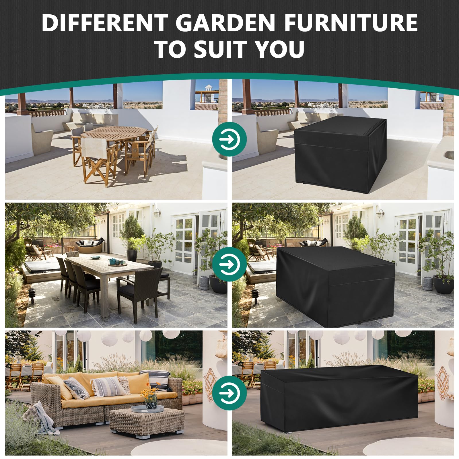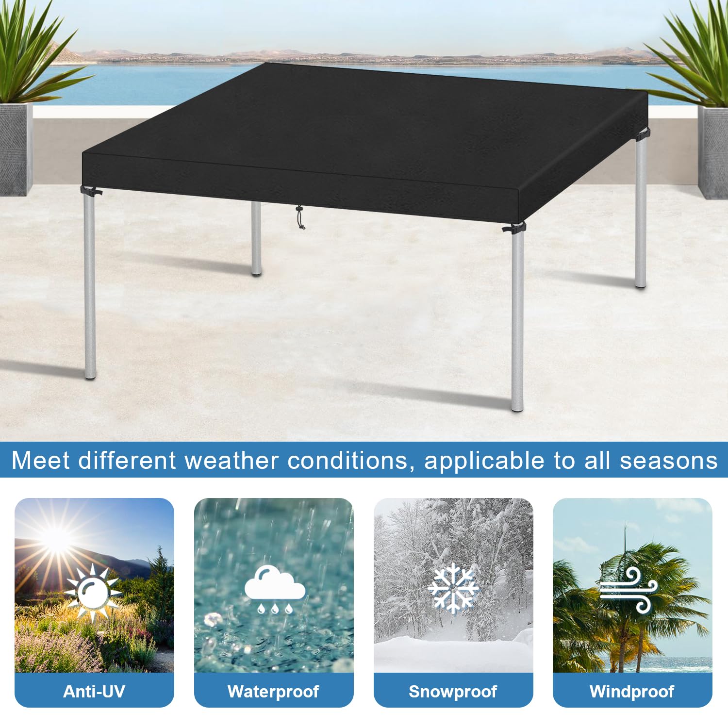 [Résistant aux intempéries] Fabriquées à partir de tissu Oxford robuste, ces housses protègent vos meubles de la pluie, de la neige et des rayons UV nocifs, de la décoloration et de l'usure au fil du temps. Housses de mobilier de jardin imperméables, tissu Oxford 420D, résistantes aux intempéries, aux UV et aux déchirures, pour tables et chaises (200 x 160 x 70 cm * Protection ferme contre les intempéries : fabriquée à partir de tissu Oxford robuste, cette housse offre une protection exceptionnelle contre les conditions météorologiques difficiles telles que la pluie, la neige et les rayons UV, protégeant vos meubles de la décoloration et de l'usure au fil du temps. Facile à nettoyer : le matériau imperméable facilite l'entretien ; il suffit de rincer à l'eau et de laisser sécher au soleil pour garder vos housses comme neuves. Respirante et résistante aux déchirures : conçue pour la durabilité, cette housse est à la fois respirante pour éviter l'accumulation d'humidité et résistante aux déchirures pour résister aux rigueurs des environnements extérieurs. Design coupe-vent sécurisé : avec une corde réglable à l'ourlet inférieur, ces housses restent fermement en place par temps venteux, vos meubles d'extérieur restent protégés même par temps difficile. Caractéristiques : * Nom du produit : housse de meubles de cour quatre pièces. Housse Imperméable 420D Housse De Protection Pour îlot De Jardin - Imperméable, Résistante UV Et Intempéries - Tissu Oxford 420D - Noir (230x90x50 Cm) Housse Ajustable Cordon Serrage Protection complète des meubles : cet ensemble de housses de meubles de quatre pièces comprend 1 housse de canapé, 2 housses de chaise à accoudoirs et 1 ensemble de table basse, une protection complète pour vos meubles d'extérieur contre les éléments. * Design coupe-vent : avec une corde réglable à l'ourlet inférieur, cette housse est conçue pour rester en place en toute sécurité par temps venteux, vos meubles d'extérieur restent protégés même par temps difficile. Compatibilité : cour, jardins, *Nombre de pièces : 4., Contenu de l'emballage : 1 housse de canapé., 2 housses pour accoudoirs. La texture du tissu donne un aspect haut de gamme et garantit une protection longue durée contre le mauvais temps. Idéale pour l'extérieur, elle résiste à l'usure quotidienne et protège ton mobilier contre les aléas climatiques Protection Table Housse De Protection Pour Meubles De Jardin Protection Pour Meubles De Jardin Tissu Oxford Impermeable Bache De Protection Uv Avec Cordon Et Serrure Noir 315x160x74cm 210d 84440106 Table De Jardin 1 table basse : 99 x 50 x 35 cm., Couleur : voir photo.