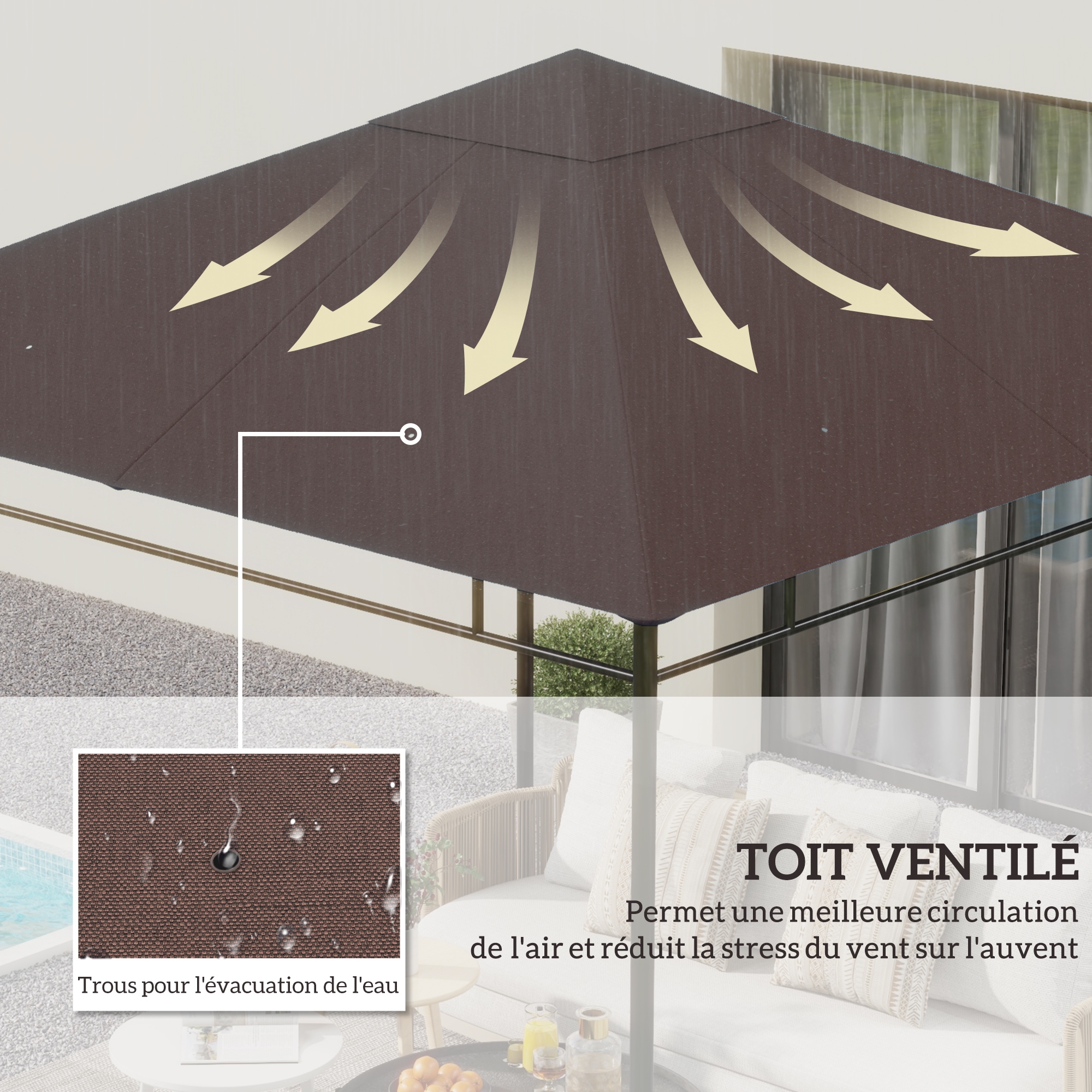 16 attaches Velcro solides rendent l'installation plus sûre et plus facile. Avec un revêtement PA qui protège des rayons UV et un indice d'imperméabilité de 800 mm, la Toile de Remplacement pour Pavillon Tonnelle offre une protection fiable à l'extérieur en plein soleil ainsi que sous des pluies légères et modérées. Toile de rechange pour gazebo Votre gazebo a besoin d'un coup de neuf ? Optez pour une toile de rechange afin de redonner vie à votre espace extérieur. Que votre gazebo soit de forme carrée, rectangulaire ou hexagonale, vous trouverez sur la toile parfaitement adaptée à votre structure Multi occasion]Cette toile de rechange pour pavillon peut transformer votre jardin ou votre balcon en une véritable oasis de bien être. Il est un bon choix pour les réunions à l’extérieur avec votre famille ou un endroit idéal pour prendre le thé du matin ou bavarder avec des amis Convient à un large éventail d'activités de plein air : la Toile Ombrage Exterieur offre un large espace ouvert pour environ 6 personnes. Protection Tonnelle Imperméable Toit De Remplacement Pour Tonnelle 3x3m - Housse Double Protection Imperméable - Tissu Oxford 420D - Beige Accessoire Pavillon Jardin Qu'il s'agisse d'un voyage de camping, d'un événement sportif ou de tout autre rassemblement en plein air, le Pavillon Dach est imperméable, ventilé et protégé du soleil et de la pluie. Facile à ranger et à transporter : La Toile de Rechange Tonnelle peut être facilement démontée et pliée pour être rangée. Auvent de rechange pour tonnelle 3 x 3 m, 1 pièce, couverture supérieure à deux niveaux, pavillon de jardin, auvent de terrasse, couverture résistante aux intempéries – acheter les meilleurs produits dans Cela garantit une meilleure circulation de l'air et une extraction efficace de la fumée, même lors de barbecues en plein air, ainsi qu'une réduction rapide de la température intérieure. Description du produit : Le Toit de Remplacement pour Pavillon de Jardin est fabriqué en polyester 300D ripstop, imperméable, d'un poids de 160g/m2., Le revêtement PA protège contre les rayons UV et a un indice d'imperméabilité de 800 mm. Informations sur le produit : Taille du produit : 3*3m Matériau du produit : tissu polyester 300D Poids du produit : 160g/carré Finition du produit : revêtement PA Poids net du produit : 2kg Taille de l'emballage individuel : 35*28*7cm Étanchéité : 800mm