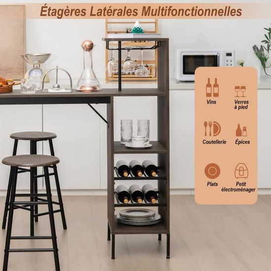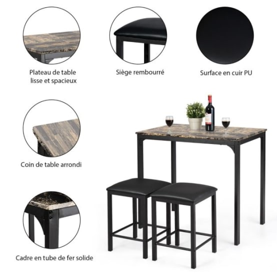【Style Rétro: 】Avec des finitions en bois ancien et des lignes épurées, l'ensemble de table cuisine peut être assorti à n'importe quel style de décoration. KANPE - Ensemble Table de Bar avec Etagères + 2 Tabourets Velours Côtelé Gris Konae | Leroy Merlin Doté d'une large surface de table et de 2 tabourets, notre ensemble de table de bar et de tabourets est un choix parfait pour vous et vos amis pour déguster une tasse de café ou discuter joyeusement 【Structure Solide & Stable : 】La table à manger est construite avec des pieds de support épaissis de 5 cm et renforcée par une grande base de soutien, assurant une bonne solidité. Il y a 4 étagères sous la table, offrant un espace de rangement pour les boissons, la vaisselle, les pots à épices, les collations, les magazines et plus encore. La table étroite avec des étagères de rangement latérales pour les vins, ustensiles et autres fournitures de bar. Les 2 tabourets de bar sont confortables pour s’asseoir et légers à déplacer 【Gain de Place:】Les chaises peuvent être pliées en 1 seconde, économisant de l'espace au sol lorsqu'elles ne sont pas utilisées, ce qui convient aux petits espaces et aux pièces limitées. 【Ensemble Table et 2 Tabourets: 】Une longue table à manger et 2 chaises rondes pliables, vous permettant de profiter du petit déjeuner ou du dîner en famille ou de prendre un thé l'après-midi avec un ami. COSTWAY Table Haute Cuisine Avec 4 Tabourets, Cadre En Métal, Table Cuisine Avec Tabouret Cadre En Metal Table Cuisine Avec Tabouret Encastrable Panneaux Plus Epais Style Industriel Mange Debout Pour Salle A Manger Restaurant Salon 81720219