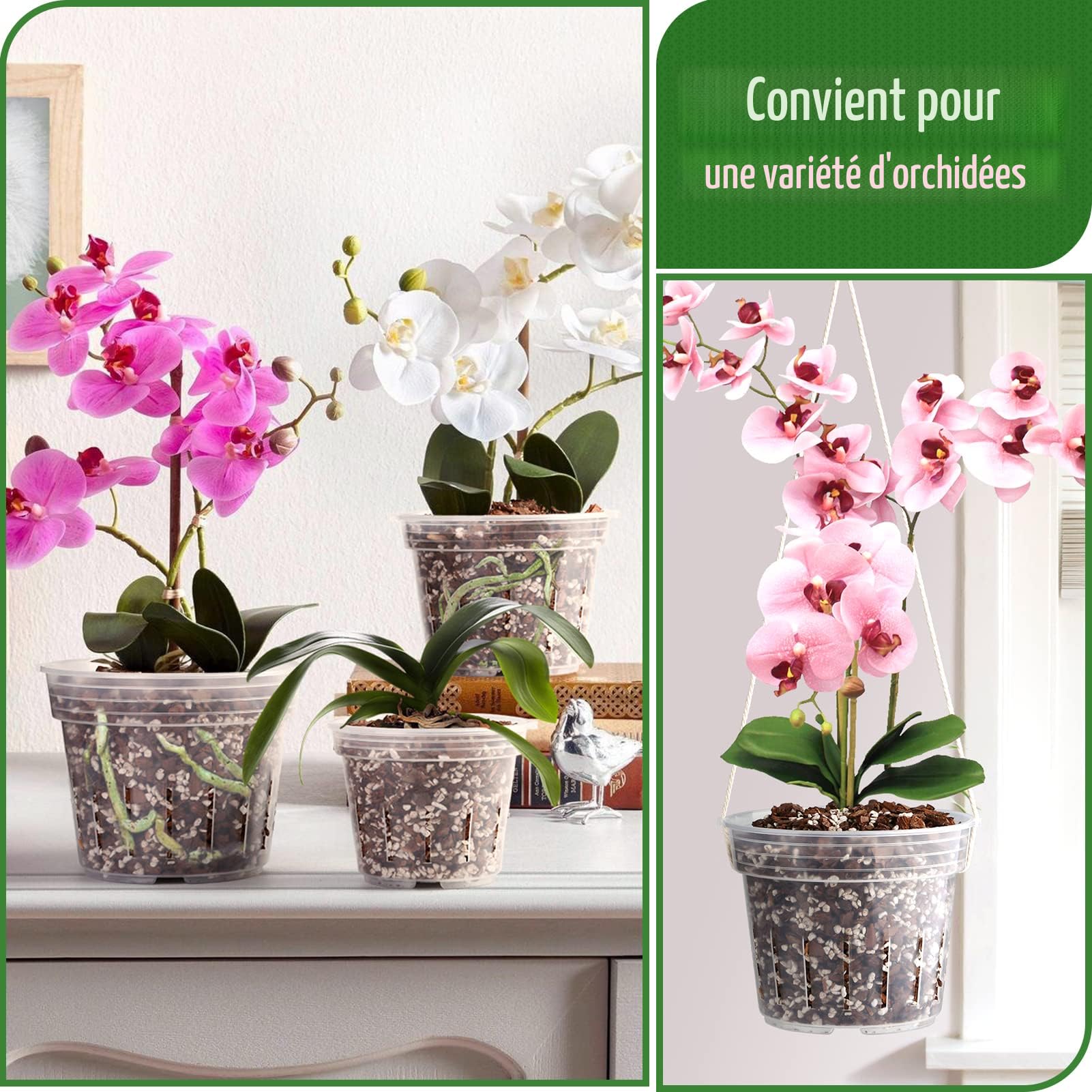 Transparence élégante : le design transparent met en valeur les superbes structures racinaires de vos orchidées, apportant une touche de sophistication à votre décoration d'intérieur. Parcourez notre sélection de pots d'orchidées transparents : vous y trouverez les meilleures pièces uniques ou personnalisées de nos boutiques Caractéristiques : * Drainage efficace : chaque pot d'orchidée est conçu avec un trou de drainage qui assure une bonne gestion de l'humidité, favorisant une croissance saine des racines et des problèmes d'arrosage excessif. Construction : fabriqués à partir de plastique, ces pots sont résistants aux fissures et à l'usure, ce qui les rend fiables pour l'entretien des plantes d'intérieur. Ensemble complet : ce paquet contient cinq pots avec des soucoupes assorties, offrant une solution tout-en-un pour vos besoins de plantation d'orchidées. Dimensions parfaites : avec un diamètre supérieur de 17 cm, elles sont conçues pour mettre en valeur une variété d'orchidées et d'autres plantes d'intérieur sans effort. *Dimensions parfaites : avec un diamètre supérieur de 17 cm, ces pots ont la taille pour nourrir et mettre en valeur efficacement une variété d'orchidées et d'autres plantes d'intérieur. Lot De 10 Pots Transparents Pour Orchidées, Plantes Grasses, Plantes D'Intérieur - Lot De 10 Drainage efficace : chaque pot est équipé de trous de drainage qui facilitent les niveaux d'humidité appropriés, assurant des racines saines et des problèmes liés à l'eau. * Construction : fabriqués à partir de plastique transparent de haute qualité, ces pots sont conçus pour durer, offrant une résistance contre les fissures et l'usure, ce qui les rend adaptés à divers environnements intérieurs. Nombre de pièces : 5 pièces. Matériau de haute qualité : les pots de fleurs en plastique transparent sont fabriqués en plastique robuste, recyclable, très léger et résistant aux chocs, peuvent être stockés au soleil pendant une longue période sans devenir cassants, faciles à nettoyer et réutilisables Pot Orchidée Lot De 3 Pots D'orchidées Transparents Avec Trous YSTP - 12cm De Diamètre Intérieur Culture Orchidée Racines Visibles * Taille : diamètre supérieur : 17 cm., Couleur : voir photo.