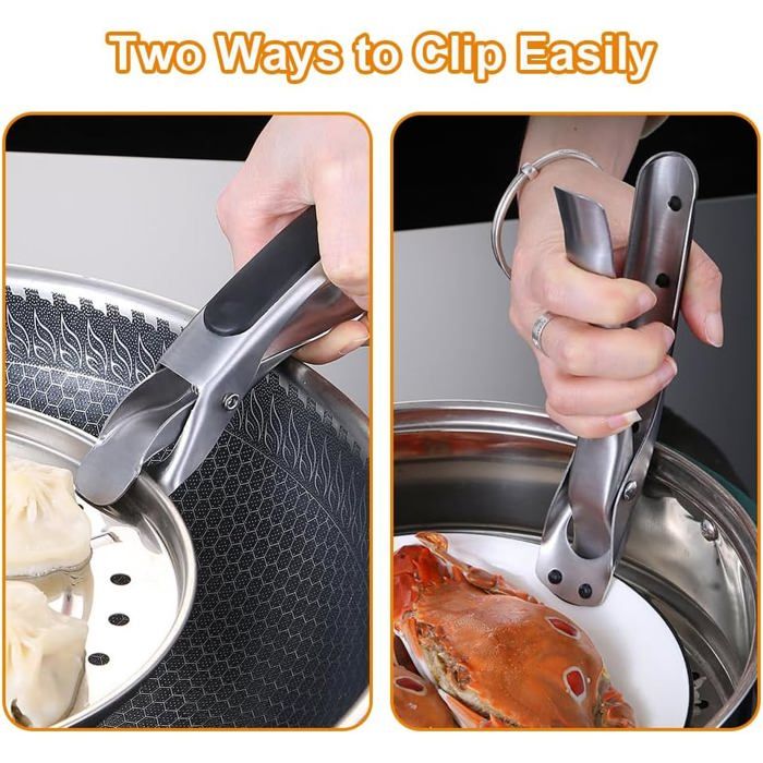 Pince À Rôtir,Pince À Bol,Pince À Marmite,Pince Anti-Brûlure De Cuisine Pince Air Fryer Ninja Lot De 2 Pince Air Fryer, Pince à Plaque Antidérapante Avec Accessoire Cuisine Silicone Résistant Chaleur et peut facilement tenir des assiettes chaudes, des bols ou d'autres ustensiles de cuisine. Caractéristiques : Pince anti-plat chaud 17,5 x 3,3 x 8 cm, taille moyenne, facile à tenir et à utiliser d'une seule main, pas de fatigue même après une utilisation prolongée. Design multifonctionnel : Notre ensemble comprend 2 pièces pince pour tenir casserole et 1 brosse en silicone, convenant à une variété de scénarios de cuisine, tels que la friteuse, le cuiseur à vapeur, le micro-ondes, etc. Cette pince à four pour friteuse à air chaud est fabriquée en acier inoxydable, qui se caractérise par une dureté élevée, une haute résistance, une résistance aux hautes températures, une protection de l'environnement et une sécurité Serrage à angles multiples : Pince de maintien anti brulure prend en charge les angles de serrage horizontaux et verticaux, ce qui est particulièrement adapté à l'utilisation dans les petits espaces et améliore la flexibilité d'utilisation. Pince de cuisine en acier inoxydable et silicone, idéale pour manipuler des plats chauds en toute sécurité. Avec ses pointes en silicone antidérapantes, elle offre une prise ferme et protège vos assiettes. Compacte (16,8 x 3,5 cm) et légère (87 g Large éventail d'applications : Pince anti brulure pour plat chaud ne convient pas seulement aux ustensiles de cuisine traditionnels, mais peut également être utilisée pour tenir des cuiseurs à vapeur, des articles en verre, des articles en céramique, etc. Spécifications : Nom : Pince pour plat chaud Taille : 17,5 x 3,3 x 8 cm Couleur : Noir Matière : Acier inoxydable + Silicone Liste d'emballage : 2x Pince casserole 1x Brosse en silicone