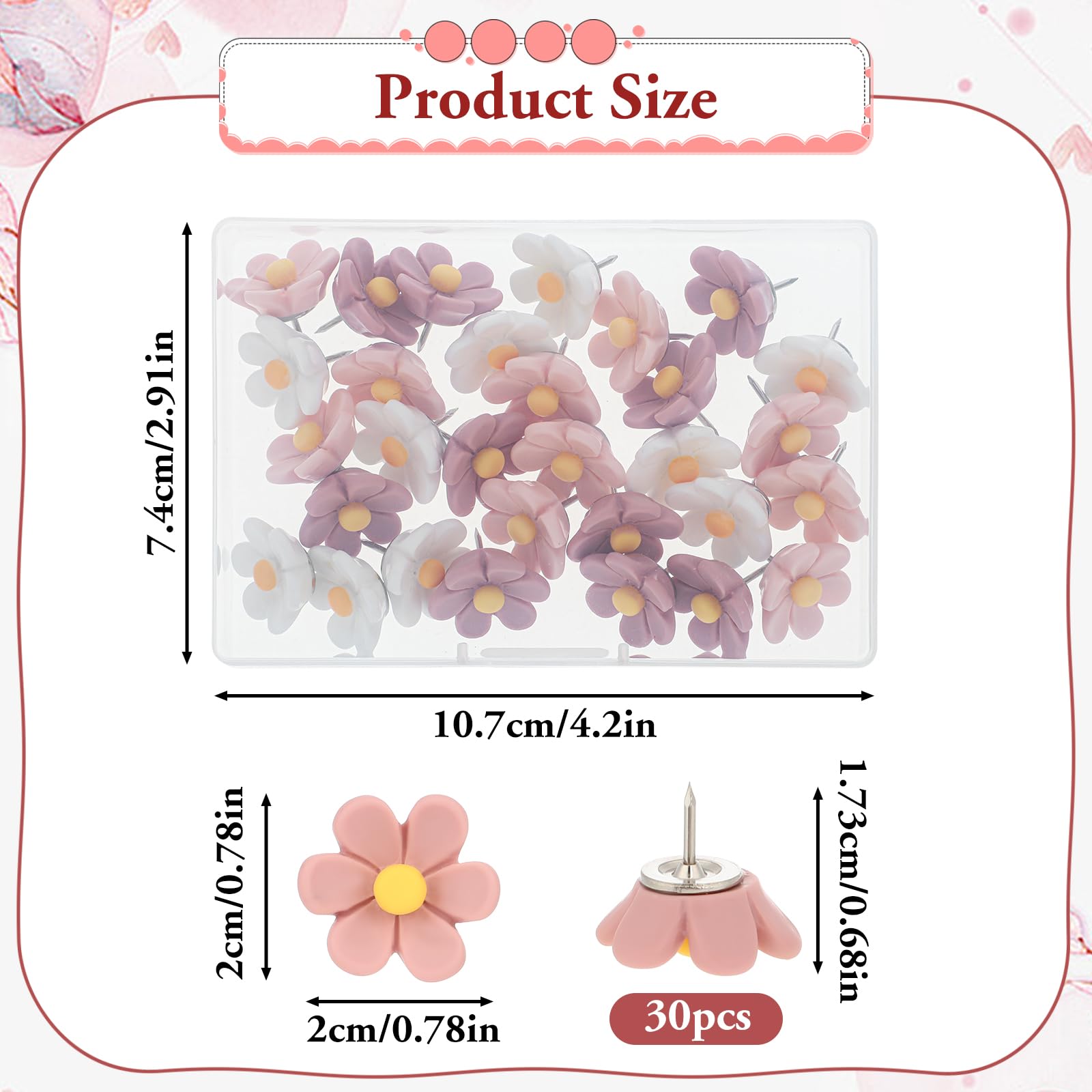 Convient pour une variété de scènes : les jolies punaises pour tableau d'affichage mesurent 0,9 cm de long et de taille moyenne. Lot de punaises en forme de fleur pour tableaux en liège, décorations murales et affichage de photos Caractéristiques : Égayez votre espace de travail avec notre lot de 30 punaises attrayantes en résine, un excellent mélange de fonctionnalité et pour votre tableau en liège Caractéristiques : Nom : épingles à fleurs Couleur : rose, rose rouge, blanc., Matériau : fer. qui peuvent répondre à divers besoins d'utilisation Que ce soit dans les bureaux, les salles de classe ou les environnements domestiques, ces punaises mignonnes peuvent ajouter une touche de beauté naturelle et fraîche à votre espace Design en fleur de cerisier : les épingles pour tableau d'affichage sont conçues en forme de fleurs de cerisier, avec une forme unique et une haute décoration. Longueur de la punaise : 0,9 cm. Temoyj Lot de 24 punaises décoratives pour tableau en liège La tête des punaises florales est raisonnablement conçue, offrant une bonne prise en main et une utilisation pratique Fonction : pour tableaux d'affichage, tableaux en liège, liège et carton, affiches suspendues, marquage de cartes, etc. Une variété d'options de couleur : les punaises en forme de fleur offrent trois couleurs de punaises, rose, rouge et blanc, les punaises florales pour tableau d'affichage sont lumineuses et diverses, et peuvent ajouter de beaux effets décoratifs aux tableaux d'affichage, tableaux en liège, etc. Style mignon avec couleur vive : 3 punaises de couleur douce pour vous aider non seulement à fixer les affaires, mais aussi comme décoration sur votre mur. Ce... Punaises Fer Punaises Décoratives Colorées à Petites Fleurs, Pour Tableau De Liège, Photo, Mur, Bulletin, Épingles à Dessin, Fournitures Scolaires Et De Bureau, 30 Pièces Décoration Tableau En Liège école Méthode d'emballage : sac., Poids brut : 85 g.