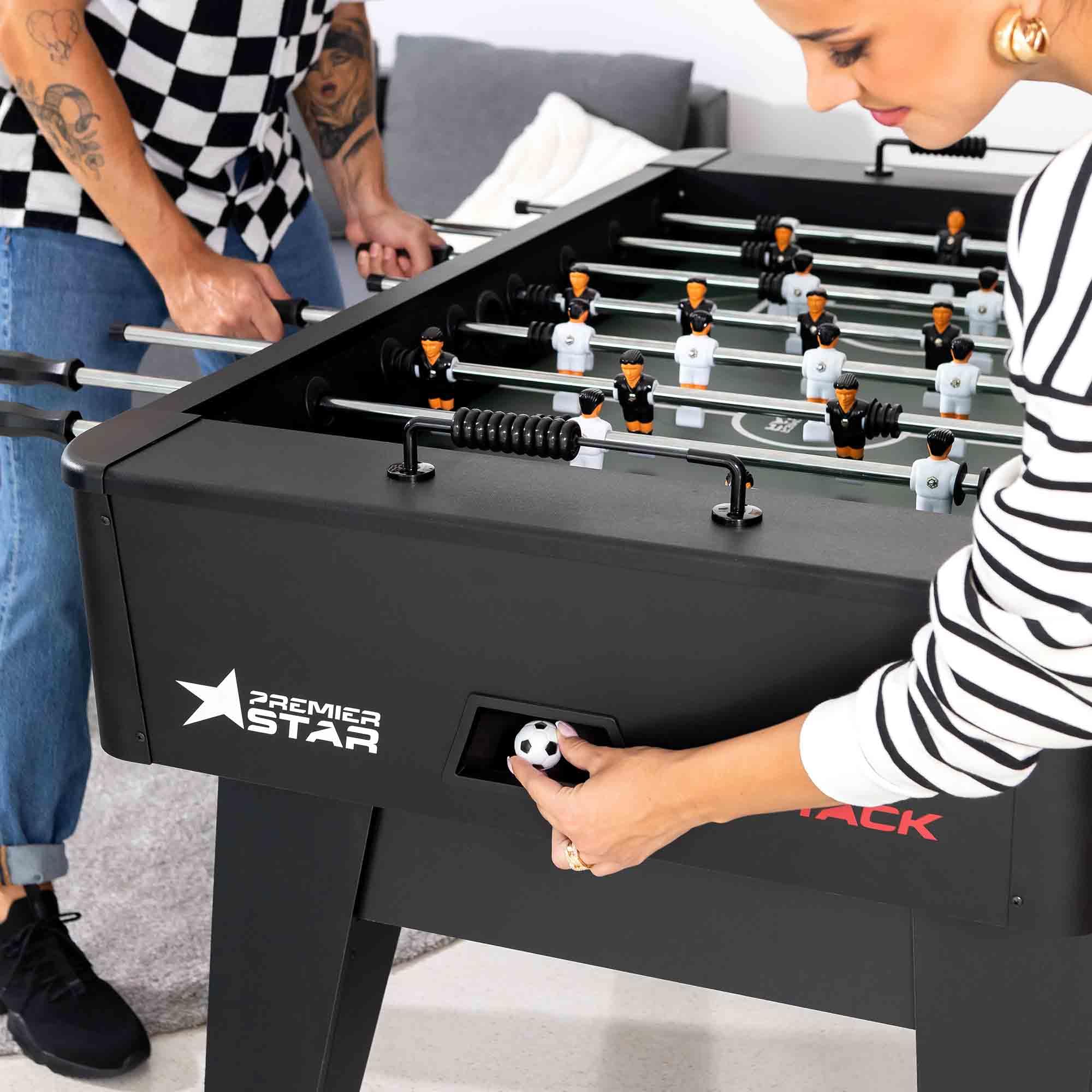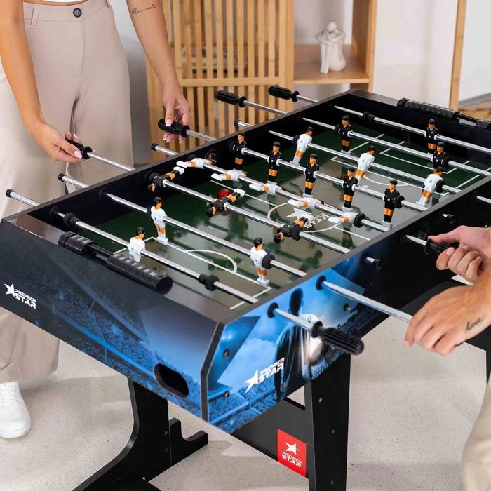 Il a été conçu pour se plier facilement et se poser verticalement. Il a été équipé de larges pieds pour assurer une stabilité plus que suffisante. La table a été fabriquée en panneaux de fibres à densité moyenne, qui ont été en outre recouverts de stratifié. Baby-foot Vallecas pour enfants avec jambes repliables STABILITÉ - Grâce à sa construction robuste, il reste fermement en place lors de chaque jeu dynamique et émotionnel. MEILLEURE FINITION - Ce baby-foot a été fabriqué à partir de panneaux MDF de la plus haute qualité, qui sont également recouverts d'une couche protectrice de stratifié. Poignées antidérapantes Les poignées de la table de jeu sont fabriquées en caoutchouc résistant. Cela protège contre les dommages extérieurs. Sous les pieds se trouvent des vis de nivellement pour compenser les irrégularités du sol. ASSEMBLAGE RAPIDE ET PLIABLE - Grâce aux instructions de montage fournies, le kicker peut être assemblé en un rien de temps. Sa forme ergonomique et son profil bien pensé vous permettent de garder tout en main pendant le jeu. Baby-foot Vallecas pour enfants avec jambes repliables Vous avez également la possibilité de plier la table lors d'une pause ou après le jeu pour gagner de la place. Gamegenic Loisir HOP-Sport® Table De Baby-Foot Corner, Table De Football Pour Enfants Et Adultes, Baby-Foot Avec 3 Ballons Pour La Maison, Très Stable Et Robuste Jeu Intérieur Enfant Adulte Babyfoot Sector de Hop-Sport. Ce sera un énorme succès lors de chacune de vos soirées. Grâce à sa construction particulièrement stable, la table de baby-foot Sector est particulièrement adaptée aux matchs de football très dynamiques. Il a été fabriqué en MDF de haute qualité résistant à l'humidité. Détails : Surface de jeu claire Le confort des joueurs n'est pas trop court avec la table de baby-foot Sector. TERRAIN DE JEU AMÉLIORÉ - Les coins du terrain de jeu sont légèrement surélevés sur cette table de jeu. Montage facile et rangement peu encombrant. Les figurines sont montées sur des barres creuses galvanisées et chromées (mais ne sont pas pré-assemblées lors de la livraison). Chaque table de jeu contient des zones inactives ou mortes. CONSTRUCTION ROBUSTE : Fabriqué en panneau MDF résistant à l'humidité, recouvert de stratifié PVC imitant le bois. Pieds larges et réglables pour une stabilité... Le terrain de jeu comprend une surface verte neutre, de sorte que les joueurs ne seront pas distraits du match de football réel avec des effets supplémentaires. 3 balles de jeu sont également incluses., Construction robuste. Pour lutter contre ce problème, les coins ont été légèrement surélevés afin que la balle puisse rouler tout seul et ne reste pas debout. Avec les instructions de montage fournies (français non garanti), la table de baby-foot Sector est montée en un tour de main.