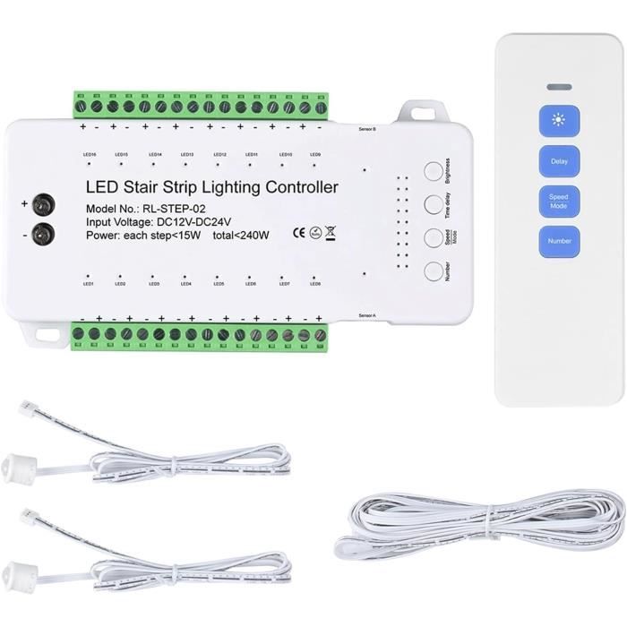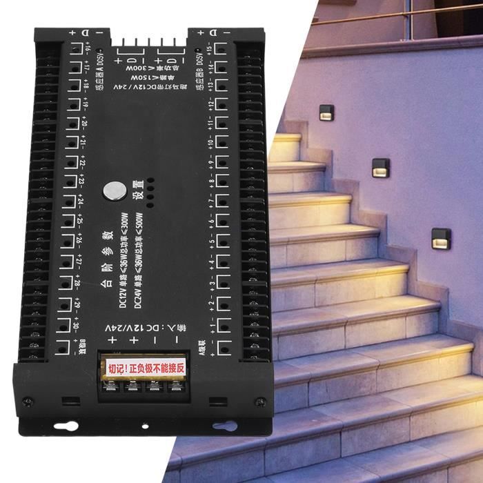 Caractéristiques : * Avec capteur de lumière du jour, lorsque la lumière ambiante est suffisante, le capteur PIR n'allume pas la lumière. Polyvalent] Le kit d'éclairage d'escalier à LED avec détecteur de mouvement est en ABS de haute qualité, rétrogradent et offre une performance robuste et * 4 modes de fonctionnement sélectionnables : mode de couleur multiple intégré, vitesse et luminosité réglables de 1 à 100 degrés *La quantité maximale de pixels peut atteindre 512 pièces. 2 détecteurs de mouvement PIR de 1 m., 1 rallonge de 5 m. Contenu : 1 contrôleur d'éclairage d'escalier, 2 capteurs de mouvement PIR d'une longueur de 1 m, une rallonge de 5 m et un capteur de lumière du jour de 1 m. Capteur De Lumière Jour Contrôleur D'éclairage D'escalier LED à Détecteur De Mouvement - Contrôleur D'éclairage D'escalier - Lumière 32 Canaux - Contrôleur Automatique De Lumière D'escalier D'échelle Pour éclairage Contrôleur WS2811 WS2818 Caractéristiques : * Nom du produit : contrôleur d'éclairage d'escalier Pixel. Compatible avec les bandes LED Pixel : convient pour une utilisation avec les bandes lumineuses LED RVB et monochromes, offrant des options d'éclairage polyvalentes. Compatibilité étendue : prend en charge une quantité maximale de pixels allant jusqu'à 512 pièces et est compatible avec les types d'IC populaires tels que WS2811, WS2818, SM16703 et TM *Numéro de modèle : Pixel-1., *Tension d'entrée : 12-24 V CC. Contrôleur de capteur de lumière - ZJCHAO - Infrarouge - 2 à 5 mètres *Quantité maximale de pixels : 512., * Prise en charge IC : WS2811 WS2818 SM16703 TM1903., *Matériau : polycarbonate., *Couleur : blanc. Le contrôleur d'éclairage pour escalier est équipé d'un capteur PIR hautement sensible qui détecte les mouvements humains ainsi que la lumière ambiante. Cette fonctionnalité permet d'allumer progressivement les marches de l'escalier uniquement lorsque cela est nécessaire, contribuant ainsi à des économies d'énergie substantielles et à une durée de vie prolongée des lampes LED. Il...