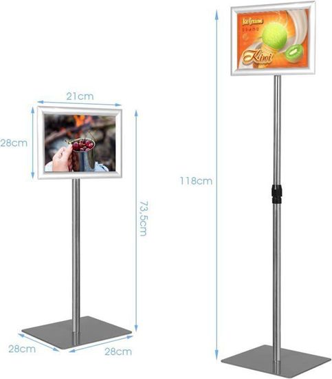 Support Affichage Information JAOGAUS Lot De 6 Supports D'affichage A4, Porte Affiche Réglable 60-100 Porte Menu Restaurant Réglable d’environnements tels que les salons professionnels, les hôtels, les écoles, les restaurants et les bureaux. Affichage réglable : la longueur de la tige peut être ajustée en ouvrant l'interrupteur central de 36,8 à 63,5 cm. Le cadre et le poteau sont reliés par des boucles rainurées, de sorte que le cadre peut être affiché horizontalement ou verticalement JAOGAUS Lot de 6 supports d'affichage A4, porte affiche réglable 60-100 cm sur pied, présentoir en métal avec base lestée stable pour entreprise, bureau, menu restaurant et affichage d'informations Idéal pour afficher des posters, menus, bureaux, restaurants et halls d’accueil. Présentez vos menus, plannings, ou panneaux de direction de façon élégante et soignée. Porte-affiches Sur Pied 133 Ou 158 Cm Cadro-Clic® A4 Et A3 Finition Alu Anodise 2 Changement d’affiche facile : Le cadre à clip facilite l’insertion et le remplacement de vos posters et supports promotionnels. Fabriqués en métal durable et dotés d'une base lestée, ces supports conviennent parfaitement aux magasins, restaurants, bureaux, hôtels, écoles, salons professionnels et bien plus encore. – Utilisation polyvalente : Parfait pour les magasins, hôtels, restaurants, bureaux, salons professionnels et bien d’autres. Hauteur réglable : Ce présentoir A4 vous permet d’ajuster facilement la hauteur de 60 cm à 100 cm pour s’adapter à différents angles de vue. Contenu du pack du porte menu A4 : – 6 × porte-affiches A4 réglables – 6 × tiges de support en métal – 6 × bases métalliques lestées Conçu pour une utilisation à long terme, il maintient vos affichages bien en place, même dans les zones à fort passage. Construction en métal durable : Fabriqué avec une tige métallique solide et une base métallique lestée, ce porte affiche A4 une excellente stabilité. Spécifications du présentoir A4 : – Compatible avec les posters, menus et annonces au format A4 – Hauteur réglable de 60 cm à 100 cm – Cadre adapté aux affiches A4 standard (21 cm x 29,7 cm) – Tige métallique et base lestée en métal pour une stabilité accrue – Cadre à clip permettant un changement rapide et facile des affiches Caractéristiques clés du porte-affiche A4 : – Matériaux durables : Fabriqué en métal de haute qualité pour maintenir vos affiches bien en place.