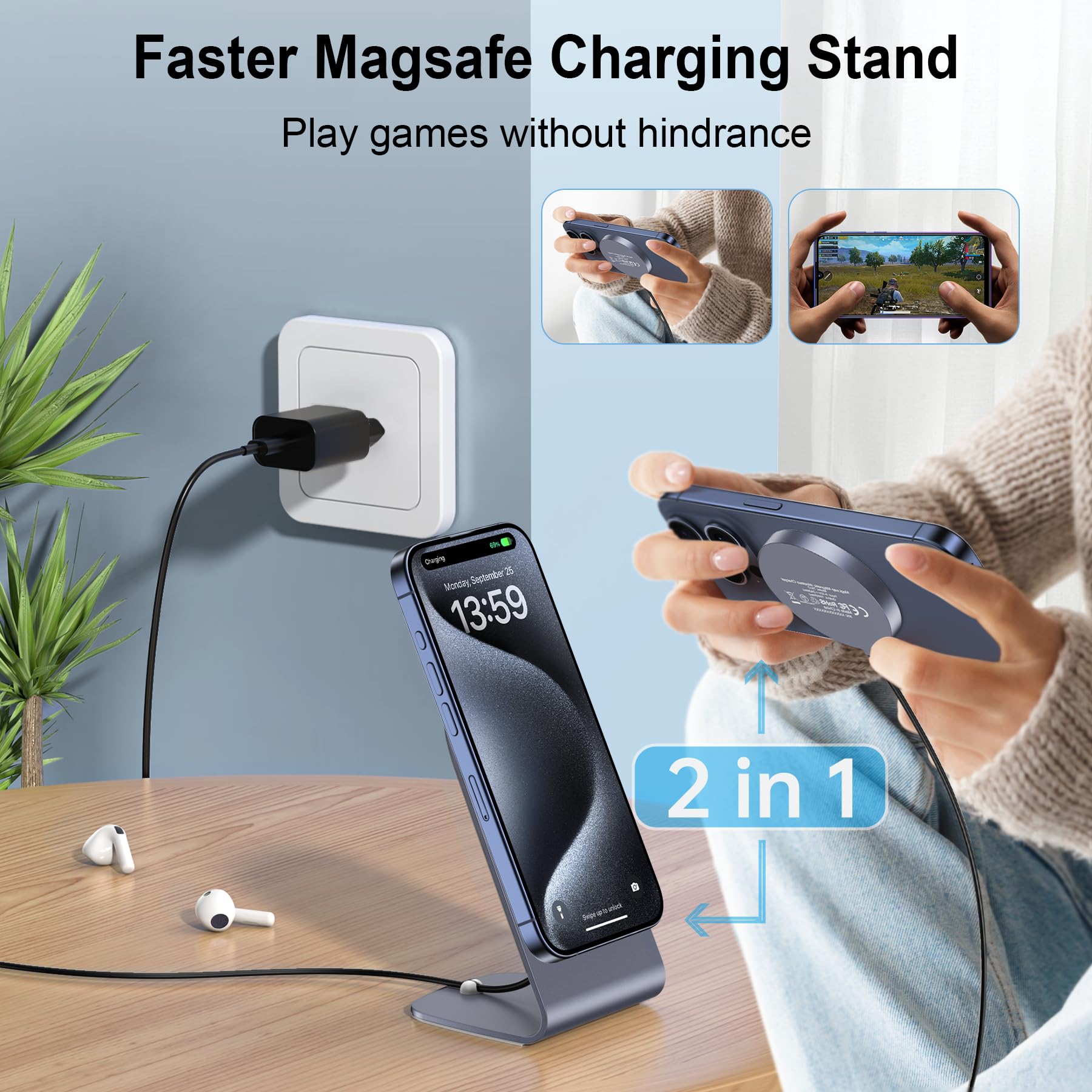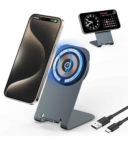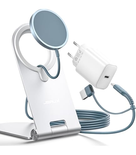 Charge rapide sans fil 15 W] L'iPhone 14 peut être complètement chargé en 2 heures et peut être chargé à 50 % en une demi-heure. La charge magnétique rapide de 15 W doit être utilisée avec un adaptateur secteur de 18 W, 20 W ou supérieur ❌Remarque : les étuis normaux ne sont pas pris en charge, car ils affaibliraient l'adsorption magnétique. Station De Charge Apple Mag-Safe Lot De 2 Chargeurs Magnétiques Sans Fil De 15 W Avec Câble USB Support Chargeur MagSafe Horizontal Vertical 1 Chargeur Magsafe 2 pour AirPods Pro/2/3 3 Horizontale & verticale 4 Idées cadeaux 5 Plus de couleurs ✈【Portable & compagnon de voyage] : Le design léger et compact du chargeur magnétique pour iPhone est assez plus petit que les autres chargeurs sans fil de bureau, il peut être mis dans les poches, les sacs à bandoulière, les sacs à main et les sacs de voyage. Le paquet comprend : 1 x chargeur magnétique sans fil, 1 x câble USB-C, 1 x chargeur rapide PD 20W, 1 x support de téléphone portable et 1 x manuel d'utilisation. Design fin et moderne : angle fixe de 60 ° maintient votre téléphone à l'angle parfait pour afficher un message entrant et une notification, répondre aux appels... Chargeur Mag Safe - Chargeur magnétique pour iPhone, support La fonction de charge magnétique permet au chargeur Mag de s'aligner parfaitement sur votre téléphone Les aimants fortement fixés vous permettent de charger en toute confiance. Une puce intelligente intégrée protège votre téléphone contre la surchauffe, la surcharge et les courts-circuits, pour que vous n'ayez pas à vous inquiéter lorsque vous utilisez un chargeur magnétique sans fil. ⚡【Nouveau design 3 en 1] : Ce chargeur sans fil est conçu pour répondre aux besoins de charge quotidiens des utilisateurs en combinant un adaptateur PD20W, un support et un chargeur sans fil magnétique, En tant que station de charge sans fil, vous pouvez placer votre téléphone à la verticale ou à l'horizontale pendant la charge pour répondre à tous vos besoins de recharge de votre série iPhone 14/12., 🌀【Alignement magnétique & forte adsorption] : Que vous travailliez, jouiez, regardiez des films, écoutiez de la musique ou discutiez simplement, le chargeur sans fil magnétique permet aux aimants de s'aligner parfaitement sur votre iPhone.