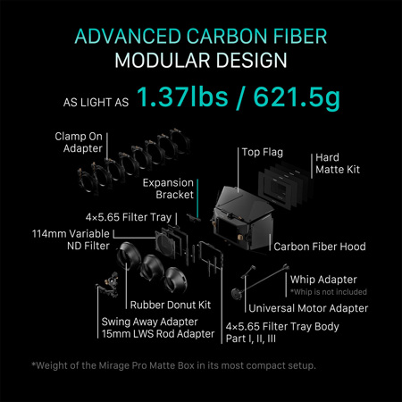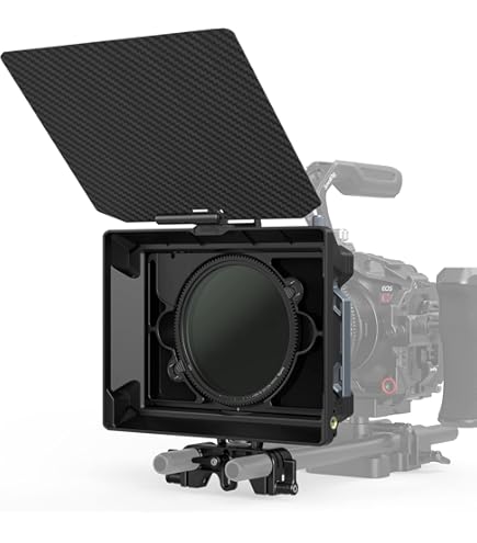 TILTA Mirage Pro Matte Box Kit de fixation simple 114 mm, pare-soleil d'objectif avec raccord de serrage de 114 mm MB-T17-S114 2 : kit de démarrage Tilta Mirage Pro Matte Box (sans support) (MB-T17-WB) * 1 Caractéristiques techniques : Dimensions : 37,1 x 25,9 x 19,8 cm., Poids : 1,5 kg. Boîte à Filtre Anti-reflet TILTA Mirage Pro Matte Box Kit De Fixation Simple 114 Mm, Pare-soleil D Boîte Mate Extensible Professionnelle Conçu avec une attention particulière aux détails, le Mirage Pro est une boîte mate à clipser conçue pour s'adapter à différentes tailles de lentilles en fonction du support sélectionné. Revêtement anti-reflet : le drapeau supérieur et l'intérieur de la boîte mate sont traités avec un revêtement anti-éblouissement, absorbant efficacement l'excès de lumière grâce à une réflexion diffuse. Compatible avec des accessoires supplémentaires tels que notre filtre VND ou END (non inclus). Conçu avec une attention particulière aux détails, le Mirage Pro est une boîte mate à clipser conçue pour s'adapter à différentes tailles de lentilles en fonction du support sélectionné Tilta Mirage Pro Matte Box VND Kit pare-soleil avec filtre ND Avec un drapeau supérieur inclus et des drapeaux latéraux en option, le Mirage Pro a la capacité de bloquer les fusées éclairantes même dans les conditions d'éclairage les plus difficiles. 【À clipser】 pour les lentilles de cinéma avec différents diamètres avant. Doté de plateaux de filtre compatibles avec les filtres 4 × 5,6, le Mirage Pro permet aux utilisateurs d'utiliser facilement les filtres pour obtenir l'esthétique visuelle souhaitée.