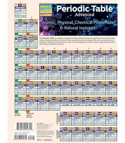 Il dispose d'une impression de haute qualité avec des couleurs vives qui rendent le tableau de chimie périodique lisible et robuste Familles d'éléments chimiques - France Minéraux Lot de 2 cartes scientifiques de tableau périodique de 22,9 x 30,5 cm - Tableau de référence chimique en acrylique - Guide d'étude pour lycée, collège, classe - Éléments pédagogiques (acrylique Retournez au dos de ce tableau périodique de chimie pour trouver un guide de référence pratique. Équipez-vous ou vos proches de ce tabla periodica essentiel et rendez l'apprentissage de la chimie plus simple et plus interactif. Ce guide contient des équations, des symboles, des constantes, des ions communs et des graphiques de conversion fréquemment utilisés, tous les outils nécessaires pour réussir tout test chimique. Il dispose de couleurs vives et d'un texte clair et lisible qui aident à différencier chaque élément, ce qui facilite l'étude et la mémorisation des données chimiques essentielles. Offrez-le comme cadeau pour les étudiants en sciences ou les enseignants pour les tenir au courant de tous les éléments Découvrez le monde des éléments avec le Zastic! Tableau Periodique Des Elements Tableau Périodique Chimique Des éléments - Tableau Laminé De 21,6 X 27,9 Cm - Guide De Référence Rapide Sur La Chimie Permacharts Tableau Référence SAT AP C'est l'outil de référence ultime qui soutient votre parcours d'apprentissage à travers le monde fascinant de la chimie. Tableau périodique détaillé - Comprend les métaux alcalins, les halogènes, les gaz nobles, les lanthanides, les actinides et les métaux de transition, avec des blocs de configuration électronique clairs (s, p, d, f Cette surface de qualité supérieure est non seulement résistante à la saleté et à l'eau, mais également facile à nettoyer, ce qui en fait un choix pratique pour les environnements académiques animés., The Zastic! Le tableau périodique de poche est un compagnon parfait pour tous ceux qui cherchent à étudier la chimie au lycée, au collège ou au niveau SAT/AP. Mesurant 22,9 x 30,5 cm, le tableau périodique laminé est parfaitement dimensionné pour un accès facile, que ce soit sur un bureau ou rangé dans un dossier. Imprimé sur du papier cartonné épais et amélioré avec une plastification en plastique de haute qualité des deux côtés, le tableau de référence laminé chimique assure durabilité et longévité. Qualité supérieure : le tableau de chimie est imprimé sur du papier cartonné épais et est livré avec une plastification en plastique des deux côtés pour lui donner une durabilité durable. Grande taille : le tableau mesure 22,9 x 30,5 cm, ce qui en fait la taille idéale pour le garder à portée de main avec vous sur une table ou dans votre dossier. C'est également un cadeau attentionné pour les amateurs de science, les aidant à rester informés des dernières connaissances élémentaires. Conçu spécifiquement pour un usage éducatif, ce tableau est idéal pour le lycée, l'université et ceux qui se préparent aux examens de chimie SAT/AP.