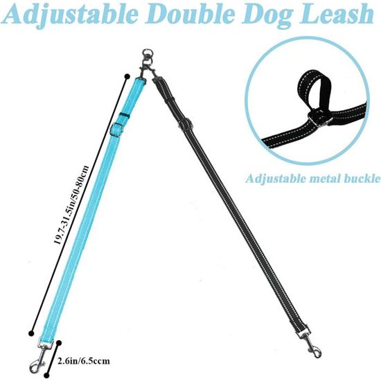 Et le bouton-pression pivotant en deux alliages est fixé sur chacune des sangles élastiques, il convient de se connecter de manière stable avec le harnais ou le collier de chien. Free Hands Design pourrait facilement contrôler 2 chiens. Le coupleur de laisse pour chien double est une laisse de chien multifonction conçue pour deux propriétaires de chiens. La conception réglable et sans enchevêtrement rend les chiens confortables sans restriction Remarque : il s'agit d'un séparateur, sans poignée.LONGUEUR RÉGLABLE --- Avec des boucles sur les sangles et des sangles élastiques à l'intérieur, cette double laisse pour chien peut être ajustée de 18 pouces à 24 pouces. La longueur réglable permet aux chiens de se déplacer confortablement sans se restreindre, ce qui le rend adapté à toutes les combinaisons de chiens de taille... La laisse rappelle également aux véhicules environnants d'éviter les accidents pour votre chien, assurant la sécurité de votre chien. Pet Walking Training Doppel leine Stoß dämpfende Bungee Dual Untangle Hunde lein Réglable et confortable --- L'attache de laisse pivotante sans enchevêtrement empêche votre chien de s'entrelacer, permettant à deux chiens de se déplacer librement. Bonne longueur réglable pour que les chiens puissent se mettre à l'aise sans se restreindre. Laisse Pour 2 Chiens Nasjac Laisse Pour Chien Double, Sans Enchevêtrement Diviseur à Double Laisse Rotation Pivotante à 360 ° Réfléchissant Longueur Réglable Coupleur Pour Deux Chiens Laisse 2 Attaches Sans enchevêtrement --- Ne vous inquiétez jamais que vos chiens s'emmêlent avec notre pièce pivotante innovante sans enchevêtrement. Multifonction et pratique --- Le coupleur de laisse pour chien double peut non seulement être connecté à une laisse de chien, mais également être utilisé avec une ceinture de sécurité. Que ce soit en marchant ou en conduisant, cela donne au chien la protection la plus sûre, pas besoin d'enlever le remplacement.