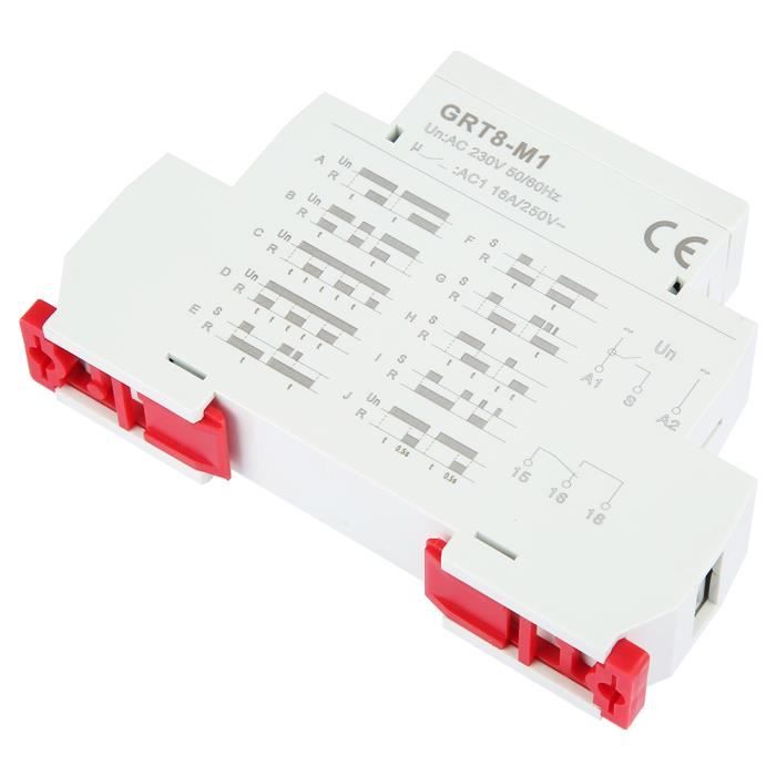 le relais temporisé multifonction peut être utilisé pour les appareils électriques, le contrôle des lumières, le chauffage, les moteurs, les pompes et les ventilateurs (10 fonctions, 10 plages de temps, multi-tension 【Multifonction】: Relais temporisé multifonction, plage de temporisation ultra-large (0,1 s à 10 jours). Plage Temporisation 0.1s à 10 Jours Jeffergarden GRT8‑M1 Relais Temporisé Multifonctionnel Avec 10 Fonctions Montage Sur Rail DIN AC 230V Timer Modulaire Rail DIN Spécification:Matériau : PCFonction : A, B, C, D, E, F, G, H, I, JBorne d'alimentation : A1-A2Plage de tension : AC230V (50/60Hz)Puissance d'entrée : CA maximum 6 VA/1,3 WTolérance de tension d'alimentation : -15 %, ±10 %Indication d'alimentation : LED vertePlage de temps : 0,1 s à 10 joursRéglage de l'heure : PotentiomètreÉcart de temps : 10 % - réglage mécaniquePrécision de répétition : 0,2 % - stabilité de la valeur de réglageContact de sortie : 1 SPDT (1NO1NC)Capacité de contact : 10A/AC1Indication de sortie : LED rougeDurée de vie mécanique : 1x10(7)Durée de vie électrique : 1x10(5)Temps de réinitialisation: maximum 200msNiveau de protection : Face avant : IP40, borne : IP20Taille maximale du câble : Fil massif maximum : 1x2,5 ou 2x1,5/avec manchon maximum : 1x2,5 (AWG 12)Taille du produit : 90*18*64mmRemarques :En raison des différents effets de moniteur et de lumière, la couleur réelle de l'article peut être légèrement différente de la couleur montrée sur les images. 【Installation sur rail DIN】: L'état de fonctionnement du relais temporisé est clairement visible grâce à l'indicateur LED. Compact, il est facile à installer et à démonter et horloge modulaire peut être installé sur un rail DIN de 35mm. Multifonctionnel : Ce relais temporisé offre une plage de temporisation ultra-large : de 0,1 s à 10 jours. La temporisation est réglable via le bouton du panneau de commande. Relais Temporisé 12v Relais Temporisé Multifonction GRT6-M1... Relais temporisé GRT8-M1 avec 10 fonctions 35MM montage rail DIN AC/DC Liste de colisage:1*Relais temporisé1*Manuel d'instructions (anglais) Le délai est réglable via le bouton du panneau de commande. Merci de votre compréhension!