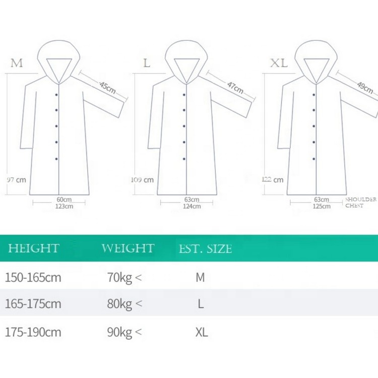 Chapeau Pluie Femme Impermeable Ensemble De Manteau De Pluie Pour Adulte En EVA Blanc Vêtement Pluie Homme Femme Jaune Matériau : fabriqué en EVA imperméable à revêtement haute densité, respirant, coupe-vent, portable. Convient pour toutes les saisons, peut vous offrir une protection en cas de forte pluie ou de grands vents Imperméable long en EVA recyclé transparent, idéal pour camping et activités outdoor. Taille adulte, unisexe, certification SGS & Oeko-tex Type de col: Officier, Manche longue Imperméable manteau de pluie en EVA translucide pour vous