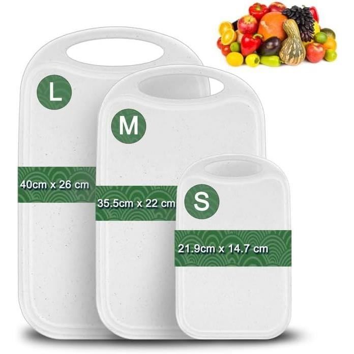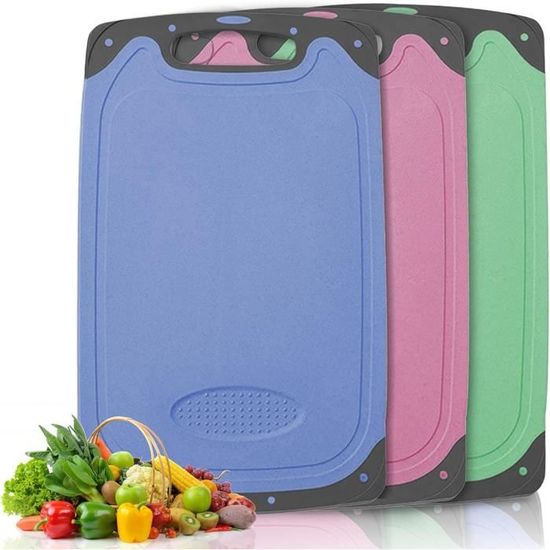 Set de 6 planches à découper avec rainure à jus,Hunnycook 22x15 cm Antibactérien Planche à découper plastique antidérapante BPA free,Petite planche à Planche Petit Déjeuner Pratique Planche à Découper En Plastique épais Avec Rainures Pour Jus, Non Lot 8 Planches Rainure Jus Ustensiles de cuisine : le lot de planches à découper en plastique est idéal pour couper les fruits et légumes, couper le pain et le fromage, préparer des collations et peut être utilisé comme planche à petit-déjeuner, tapis de petit-déjeuner, planche de service ou planche à collation. La planche à découper en plastique peut être utilisée à différentes fins, par exemple par exemple pour couper, préparer des repas, servir et bien plus encore. Détails du produit : Matériau : plastique., Couleur : noir., Dimensions : 25 x 14,8 cm. Grande planche à découper en plastique pour une utilisation polyvalente : cette grande planche à découper durable (45,7 x 30,5 cm) est parfaite pour les tâches de cuisine quotidiennes, du hachage des légumes à la sculpture de la viande Contenu du colis : 8 planches de cuisine avec rigole Taille : 35 x 21 x 0,8 cm, elle peut être utilisée en toute sécurité sur n'importe quelle surface de cuisine. Trois couleurs : Un ensemble de 3 couleurs... Design rainuré : la planche à découper mesure 25 x 14,8 cm et est entourée de rainures de jus qui récupèrent efficacement les jus et la sauce et gardent le plan de travail propre et exempt de déversements. Cette planche de cuisine en plastique avec rainure à jus se nettoie rapidement et facilement à la main ou au lave-vaisselle.