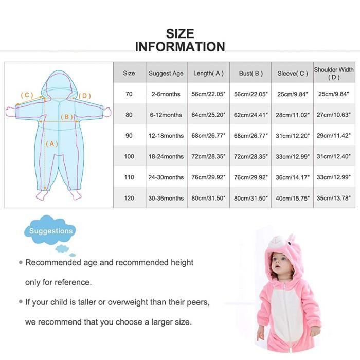 Petalum Pyjama à Capuche Bébé Barboteuse Animal en Flanelle Achetez Petalum Pyjama à Capuche Bébé Barboteuse Animal en Flanelle Combinaison Grenouillère Hiver Chaud Confortable Thermique Forme Mignon Lapin Dinosaure Tenue Naissance Garçon Fille 0 à 3 Ans livraison gratuite retours gratuits selon éligibilité (voir cond Description : Taille: 66-73-80-90 0-6 mois: Épaule 22cm / 8., 7 Poitrine 57cm / 22., 4 Hanches 61cm / 24., 0 Manche 22cm / 8., 7 Longueur 53cm / 20., 9 Hauteur Appropriée 58-66cm / 22., 8-26., 0 6-12 mois: Épaule 24cm / 9., 4 Poitrine 58cm / 22., 8 Hanches 63cm / 24., 8 Manche 24cm / 9., 4 Longueur 57cm / 22., 4 Hauteur Appropriée 65-73cm / 25., 6-28., 7 12-18 mois: Épaule 24,5 cm / 9,6 Poitrine 60cm / 23,6 Hanches 66cm / 26,0 Manche 25cm / 9,8 Longueur 61cm / 24,0 Hauteur Appropriée 73-80cm / 28,7-31,5 18-24 mois: Épaule 25cm / 9., 8 Poitrine 62cm / 24., 4 Hanches 68cm / 26., 8 Manche 27cm / 10., 6 Longueur 65cm / 25., 6 Hauteur Appropriée 80-90cm / 31., 5-35., 4 Attention : 1., La couleur des vêtements peut être différente de celle des images en raison de limites de la photographie., 2., Etant donné que les produits sont de tailles asiatiques, ils peuvent donc y avoir des écarts de 1-2 cm, nous vous prions alors de bien consulter le tableau des mesures attentivement avant de faire votre achat, nous pourrons changer celle-ci à la taille française selon vos besoins., 3., Si le produit rencontre un problème en cours de logistique, veuillez nous contacter le plus tôt possible et nous le réglerons dès que possible, en vous remerciant en avance de votre compréhension. Recommandé pour les bébés de 0 à 24 mois, la conception raisonnable avec la fermeture à glissière et l'usage des mélange de coton de qualité doux et... Body Intégral Fermeture éclair Pyjama,Bebe Combinaison Pyjama,Grenouillère Barboteuse À Capuche,Bébé Combinaison Hiver Forme Animal Déguisement(Lion-70cm) - Puériculture & Eveil Bébé Grenouillère Bébé Fille Choix de deux couleurs, ce pyjama à capuche barboteuse désigné en forme d’animal va rendre votre bébé encore plus adorable ; convient pour le printemps et l’automne, costume pyjama de bébé parfait pour toutes les occasions : dans la vie quotidienne ou pendant le temps des fêtes., Fermeture : Fermeture éclair, Sans manche