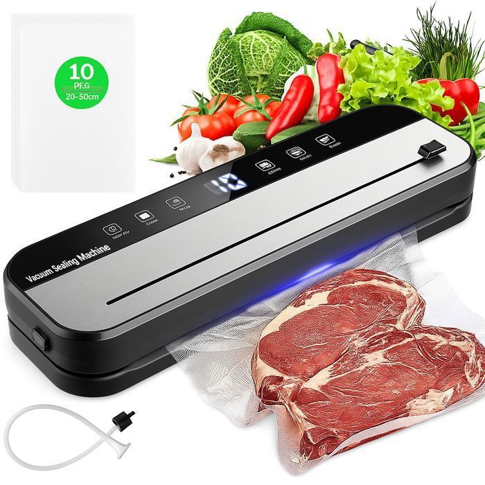 Dites adieu aux plaques enfichables et aux câbles encombrants, la soudeuse à film est équipée d'une batterie intégrée de 1200 mAh qui peut supporter 40 à 60 utilisations avec une seule charge, ce qui évite de devoir changer fréquemment les piles L’appareil de mise sous vide permet la conservation prolongée des aliments. Il est indispensable en cuisine pour lutter contre le gaspillage. En effet, chaque Français jette 155 kg de nourriture par an 【Scellage efficace pour conserver la fraîcheur】 Vous recevrez une mini soudeuse à film d'aspect compact et raffiné, équipée d'une aspiration puissante de 60 Kpa, une mise sous vide rapide en 10-20 secondes, une soudure rapide en 2,5-5 secondes, qui permet de conserver les aliments frais plus longtemps. Ses fonctions polyvalentes le rendent plus facile à utiliser. Sa charge rapide en deux heures et sa conception sans fil le rendent parfait pour le camping, les voyages en camping-car et le rangement facile à la maison, afin que vous soyez toujours prêt à sceller vos aliments. Le mini appareil de mise sous vide aide à conserver les restes de snacks, les aliments, les céréales et les fruits et à les garder secs et frais pendant longtemps 【3 réglages】 La mini soudeuse à film offre trois niveaux de réglage de la température grâce à un affichage LED clair, qui peuvent être utilisés pour sceller des sachets de différentes épaisseurs. 80Kpa Machine Sous Vide Alimentaire Avec Couvercle Magnétique, 10-En-1 Double Pompe Et Double La bande de soudure de 110 mm de large et de long facilite le scellage. Il est entièrement naturel, ne contient aucun conservateur et est plus sûr. Le troisième niveau convient à certains sacs relativement épais afin d'éviter toute surchauffe et de garantir une fermeture hermétique à chaque fois Pour une option économique, le VEVOR Vacuum sealer se décline en différents modèles, offrant une puissance de 100W à 120W. Appareils de mise sous vide... Appareil Mise Sous Vide 60kpa Rechargeable Machine De Mise Sous VideMachine De Mise Sous Vide Pour Aliments Secs Et Humides 60 Kpa Appareil Sous Vide Portable Voyage Le premier niveau convient aux sacs en plastique transparent, aux sacs Opp et aux sacs en cellophane.