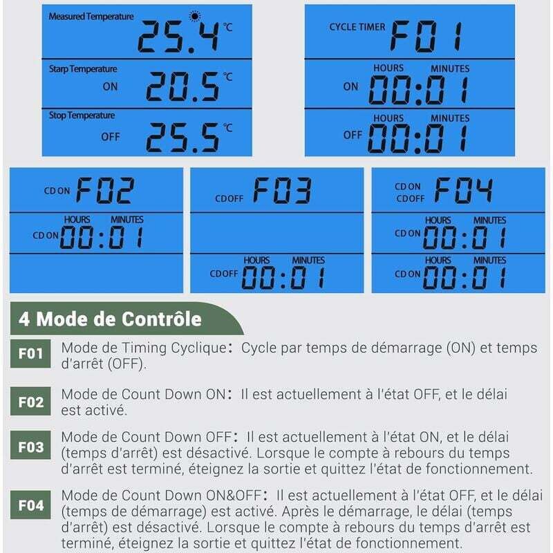 Régulateur Pour Serre Aquarium Thermostat À Tapis Chauffant Régulateur De Température Numérique Prise Thermostat Idéal pour les incubateurs, les salles pour reptiles, les radiateurs, les serres, les réfrigérateurs, les fours, etc. Thermostat numérique programmable réglé sur économie d'énergie 78... Il fonctionne en Fahrenheit et Celsius. La fonction mémoire intégrée conserve les réglages en cas de coupure de courant. Ce Regulateur de Temperature Numerique prend l'étalonnage de température pour des ajustements ultra-précis. Et il dispose d'une fonction de réinitialisation pour un nouveau départ à tout moment Fonction de réinitialisation : Tous les paramètres de configuration du système sont restaurés à leurs valeurs par défaut; fonction de correction de température, contrôle haute précision. Optimisez la qualité de vie et favorisez la productivité. Prise thermostat numérique pour régulateur de température 220 Largement utilisé: Ce prise thermostat regulateur de temperature numerique vous permet de contrôler précisément la température ambiante. Description du produit: 1., Le réglage des températures de démarrage et d'arrêt permet de contrôler automatiquement les appareils de chauffage et de climatisation. Plage de temps: 0 à 99 heures et 59 minutes, précision: 1 minute maximum., 3., La prise thermostat regulateur de temperature numerique est fabriquée en polycarbonate ignifuge, durable et sûr. Thermostat multifonction: Ce prise thermostat regulateur de temperature numerique est doté d'une fonction de mémoire unique qui enregistre tous les paramètres définis après une mise hors tension. Spécifications: Couleur: Blanc Matériau: PC ignifuge Dimensions du colis: 11,4 x 8,2 x 6,5 cm; 200 grammes Piles requises: Non Contenu du colis : 1 x Prise Thermostat Regulateur de Temperature Numerique Son utilisation intuitive le rend particulièrement convivial. Fonctionnalités supplémentaires : Notre prise thermostat regulateur de temperature numerique est doté d'un grand écran VA, facilitant son utilisation, même dans les environnements sombres. Plage de température: -40 °C à 120 °C, contrôle précis avec une précision de ± 1 %., 2., Avec quatre modes de minuterie (F01-F04), la prise thermostat regulateur de temperature numerique offre une gestion flexible du temps, idéale pour une large gamme d'applications.