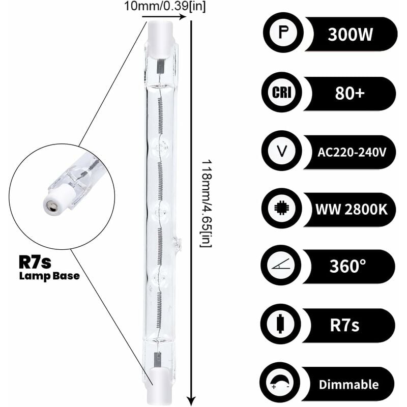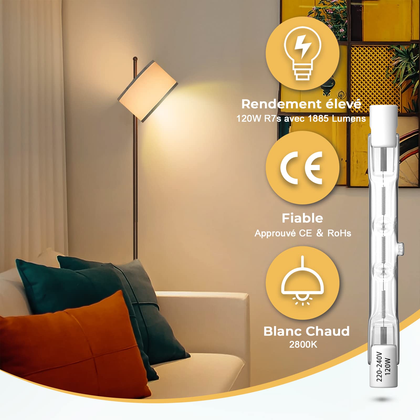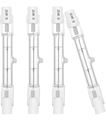 S'allume instantanément 100% instantané, aucun temps de préchauffage requis. DoRight 120W R7s 78mm Ampoules Halogènes Linéaires Blanc Chaud 2800K 1885lm Gradable J118 Projecteur Halogène Linéaire à Double Extrémité R7s pour Lampadaire, Lampe de Sécurité (Paquet de 5 Pas de scintillement, haute luminosité. Ampoule Halogène R7S 120W 78MM Travailler avec des Gradateurs Halogènes Remarque : ces ampoules halogènes sont dimmables à l'aide des gradateurs conçus pour les ampoules à incandescence et halogènes. Porte Largement utilisé comme éclairage de porte, de salle d'exposition, de scène et de studio, etc. Ampoule Halogène 78mm DoRight 120W R7s 78mm Ampoules Halogènes Linéaires Blanc Ampoule R7s Pour Lampadaire Couleur de la Lumière: Blanc Chaud 2800K. Installation Facile Veuillez éteindre la source de lumière avant l'installation. Veuillez vous assurer que la base de l'ampoule à double extrémité correspond à celle de votre luminaire. Angle de faisceau: 360 Degrés , Pied de Lampe: R7S , Dimmable : Oui DoRight 6.5W Ampoule R7s LED 78mm Blanc Chaud 3000K avec Angle de Tension d'entrée: AC 220-240V. Ampoules Halogènes G4, Lampe de Base à Broche Halogène 12V 20W, Blanc...