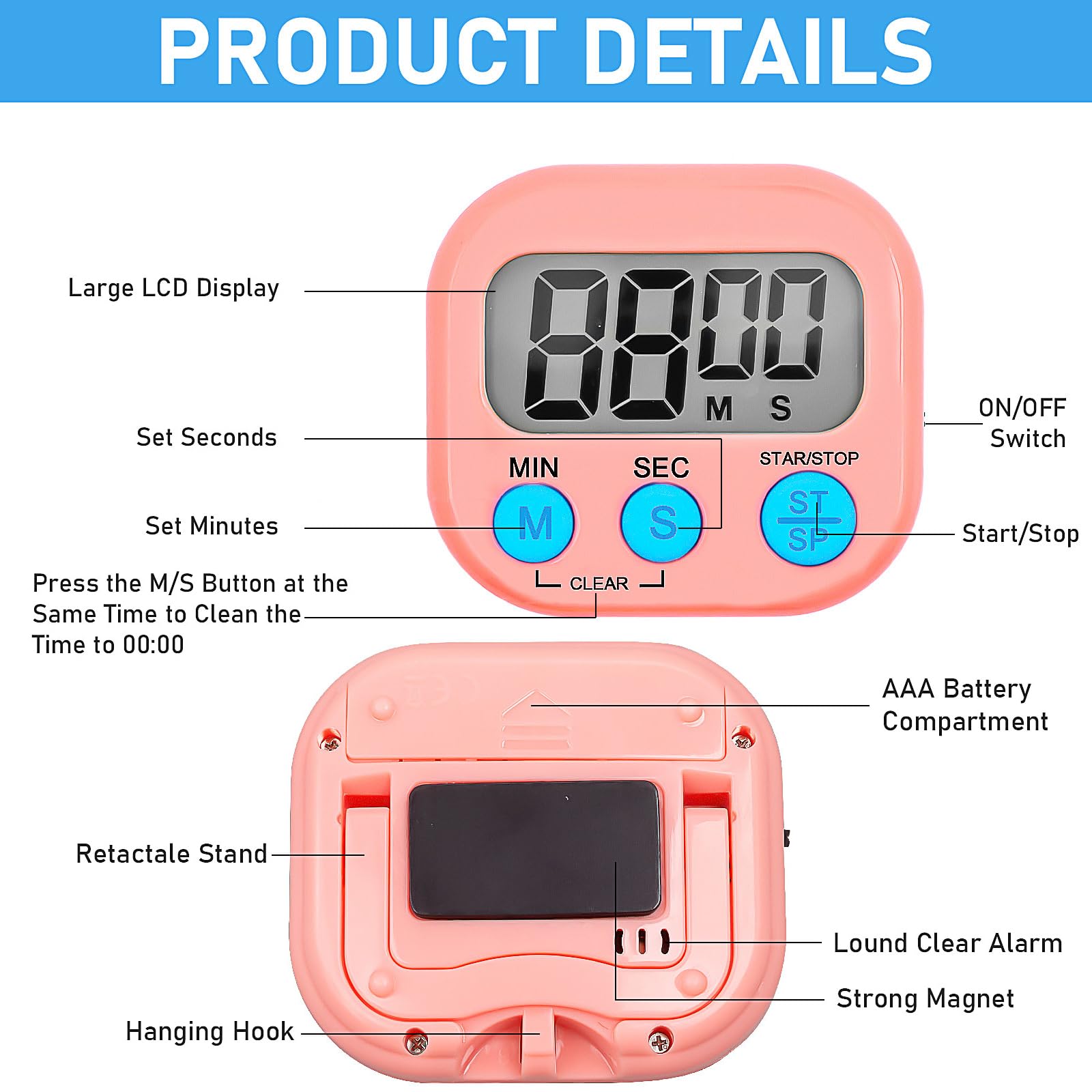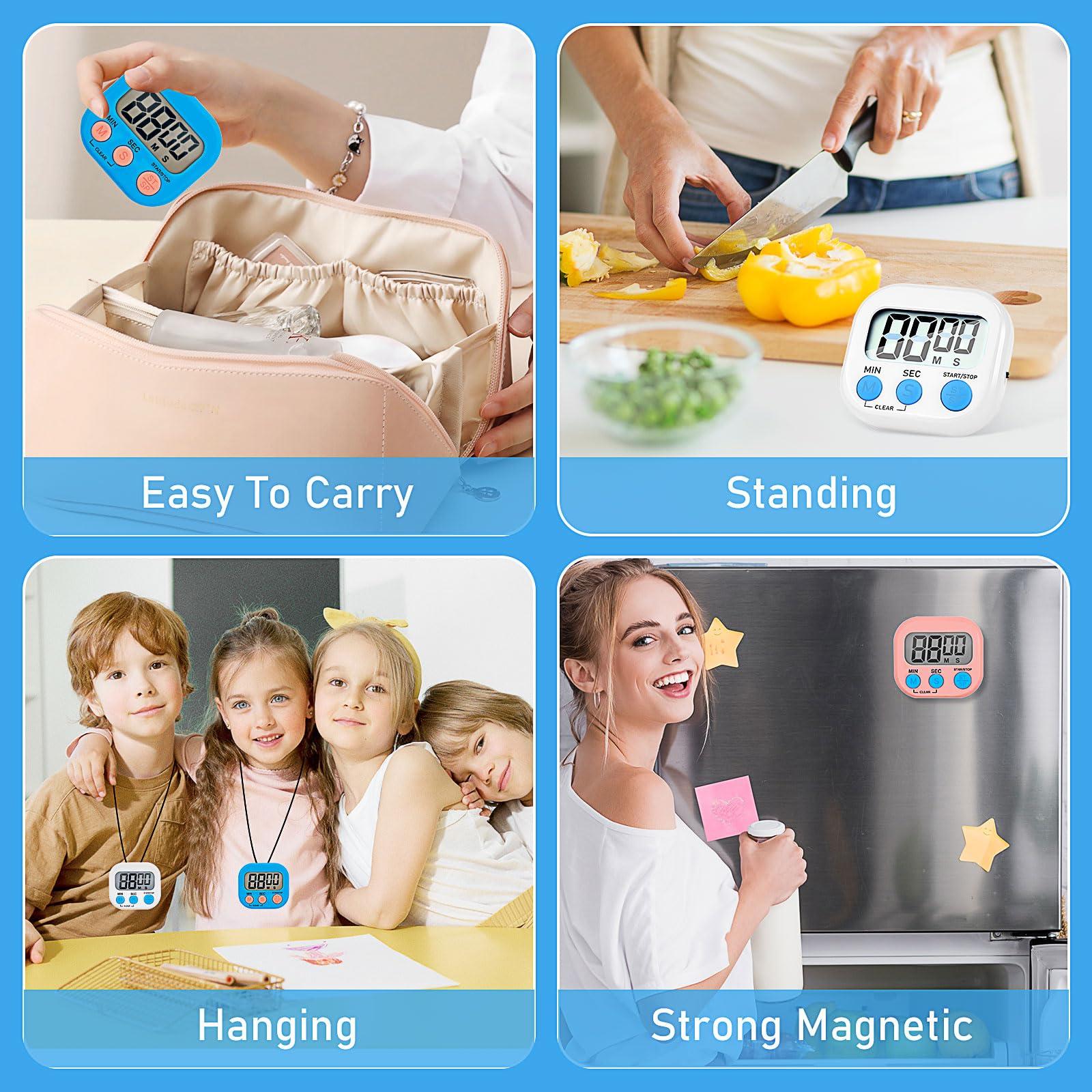 Fonctionnement simple pour tous les âges : conçue pour une utilisation sans effort, cette minuterie pour enfants et adultes commence à chronométrer avec une réinitialisation rapide de « min » et « sec » à zéro. Achetez Lot de 8 minuteurs numériques pour enfants avec 8 lanières - Minuterie numérique compte à rebours - Minuteurs de cuisine magnétiques pour la cuisine, compte à rebours des minutes pour enfants, salle Description du produit : améliorez votre gestion du temps avec ce lot de 8 minuteurs numériques pour enfants – le minuteur de cuisine ultime et compte à rebours conçu pour la polyvalence et la facilité. Il comprend également un support pour les comptoirs et une corde pour l'accrocher, offrant des options de placement polyvalentes pour les minuteurs de cuisine, les sessions de gym, ou comme chronomètre partout où vous en avez besoin. Conçue pour durer, cette minuterie magnétique vous permet de rester sur la bonne voie pendant des années d'utilisation fiable. Solution de synchronisation polyvalente : des minuteurs de cuisine pour la cuisson des œufs à la gestion des devoirs avec un minuteur d'étude, ce minuteur pour enfants excelle dans divers scénarios : exercice, sport, réunions ou activités en classe. Simple à utiliser, il suffit de réinitialiser « min » et « sec » à zéro et de commencer à synchroniser – un design convivial qui transforme cette minuterie pour enfants en un jeu d'enfant pour tous les âges, alimentée par une seule pile AAA (non incluse). Flutesan Lot de 6 minuteurs de cuisine numériques pour la cuisine L'alarme forte de ce minuteur de cuisson offre des rappels opportuns, parfait pour les cuisiniers occupés, les étudiants ou les parents en l'utilisant comme minuterie d'étude ou de classe. Avec une plage de minuterie allant jusqu'à 99 minutes et 59 secondes, il sert également de chronomètre et de minuteur, parfait pour les minuteurs de cuisine pour la cuisine, les activités en classe, les entraînements de gym ou même les rappels de nettoyage des dents. Idéal pour les minuteurs de cuisine pour la cuisine, les activités en classe, les entraînements de gym ou la gestion du temps des tout-petits, c'est votre horloge tout-en-un pour une planification précise. Grand écran LCD clair : compte à rebours dispose d'un écran LCD de 6,6 cm avec des chiffres en gras, facilement lisible de l'autre côté de la pièce, idéal pour les cuisiniers occupés, les enseignants ou les enfants, même ceux qui ont une vue moins que parfaite Minuteur Cuisine Compte à Rebours 99min Chronomètre Sport Minuteur De Cuisine Numérique - Compte à Rebours Magnétique 3 En 1 Horloge Cuisine Multifonction Minuteur Cuisine Magnétique Compte à Rebours Spécifications ● Couleur : 2 blancs, 2 bleus, 2 verts, 2 roses ● Taille : 7,6 x 2,2 x 6,6 cm ● Contenu : 8 minuteurs + 8 lanières