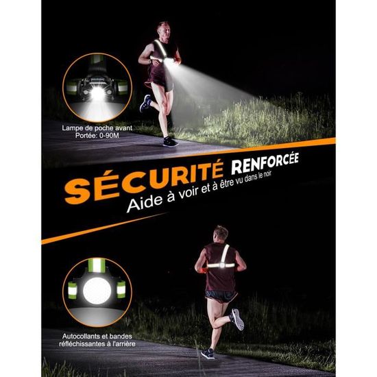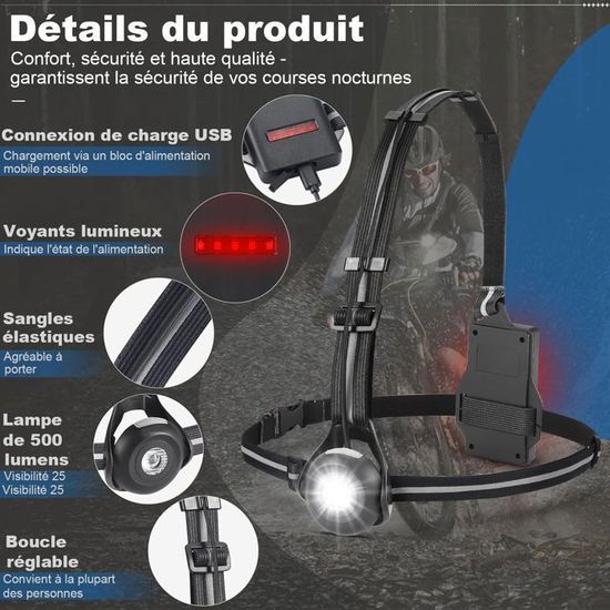 La lampe pectorale est pratique, très légère, idéale pour le jogging, la randonnée, l'escalade, le camping, la course à pied, la marche et d'autres activités en intérieur et en extérieur. Ultra Lumineux & Faisceau Ajustable]Éclairez votre chemin avec notre lampe de course LED de 500 lumens et son faisceau ajustable à 45°. Illuminez des chemins jusqu'à 90 mètres devant vous, garantissant votre sécurité dans l'obscurité Les sangles réfléchissantes offrent une protection supplémentaire grâce à leur lumière blanche à l'avant et leur lumière rouge à l'arrière. [ Légère et puissante ]: Lampe course a pied Pesant seulement environ 155 g. Cela réduit la pression sur le front et la nuque et reste confortable même lors de courses longues. Contrairement à une lampe frontale, la lampe thoracique répartit le poids sur le haut du corps. [ Angle de faisceau réglable à 90° ]: Lampe course a pied avec angle de faisceau réglable à 45° vers le haut et 45° vers le bas, permettant d'éclairer très efficacement le sol et les pentes. Équipements Running : Les indispensables pour la course à pied Le triangle lumineux d'avertissement à l'arrière clignote et est visible de loin. Pour hommes et femmes - également idéal comme cadeau. La batterie longue durée de 2000 mAh garantit des heures d'utilisation. Lampe Course a Pied,1LED Lampe Running,Lampe de Course pour... Lampe Pied Lampe De Course à Pied Rechargeable, 3 Modes, Sangle Ajustable Pour Lampe Running Rechargeable USB La lampe running de course a une portée d'environ 80 mètres, ce qui vous permet de bien voir tout ce qui se trouve devant vous.