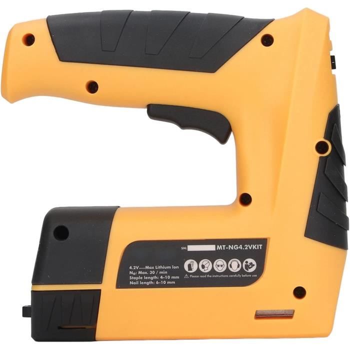 【Sûr et fiable】Équipé d'un triple mécanisme de sécurité, comprenant un interrupteur marche/arrêt, un percuteur de sécurité et une gâchette, cet agrafeur garantit que les agrafes ne sont tirées que lorsque le percuteur de sécurité est fermement appuyé contre la surface. Mais découvrez dans l’article d’autres agrafeuses cloueuses sans fil moins cher si vous en avez un usage semi-professionnel ou à la maison. En tant que décorateur d’événements j’ai eu l’occasion d’utiliser plusieurs types d’agrafeuses et je peux affirmer que je ne suis pas satisfait de tous les modèles 【Kit de cloueur sans fil 2 en 1】 Agrafeuse sans fil avec chargeur inférieur, 1 000 agrafes et 1 000 clous compatibles avec des agrafes de 1/4 à 5/8 pouce. Cette agrafeuse électrique est un cadeau idéal pour les occasions spéciales, en particulier les anniversaires, Noël et les fêtes. Lancez-vous dans vos tâches quotidiennes de bricolage avec une agrafeuse à usage rapide. Le voyant LED de charge vous indique quand elle est complètement chargée. 【Utilisations multiples et cadeau idéal】Largement utilisé pour le liège, l'entretien général, le bricolage, les objets décoratifs, l'isolation, les tissus, le cuir et d'autres applications de fixation. En plus des marques de qualité, vous bénéficierez de remises lors de vos achats de agrafeuse sans fil avec batterie lithium durant nos super promotions. N'oubliez pas cette étape : filtrez les articles ayant des avantages comme la livraison et le retour gratuits, et profitez au maximum de votre expérience d'achat en ligne Idéal pour de nombreux projets tels que la tapisserie d'ameublement, la réparation de matériaux, la décoration, la menuiserie, le bricolage de meubles Rapid BTX530 Agrafeuse-cloueuse électrique sans fil à batterie Lithium-Ion - Bricolage Agrafeuse électrique Pour Tapissier Agrafeuse Électrique, Agrafeuse Électrique Lithium-ion 2 En 1 Agrafeuse 2 En 1 Cloueur Il suffit de 2 heures pour recharger complètement cette agrafeuse électrique à l'aide du câble USB Type-C. 【Conception conviviale】Il est fabriqué à partir de matériaux légers et ne pèse que 1,47 lb. Sa conception ergonomique offre une prise en main confortable et sa taille compacte la rend très portable. Le chargeur à dégagement rapide garantit un chargement facile. Avec une cadence de tir pouvant atteindre 30 coups par minute, vous disposez de la flexibilité nécessaire pour entreprendre n'importe quelle tâche.