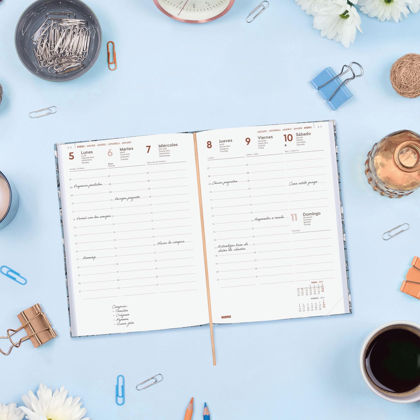 Affichage de la semaine complète à la verticale., Heures. Finocam – Agenda Spirale 2026 Semaine sur 2 pages Présentation verticale | Janvier – Décembre | Agenda annuel 2026 avec élastique | Double spirale Couverture rigide Alma – Noir – International Visiter la boutique Finocam 4,5 (109) 1 caractéristique plus durable Couverture rigide rembourrée en carton doublé avec film mat anti-rayures et détails imprimés. Contenu : l'agenda contient : les jours fériés internationaux, les phases lunaires et le début des nouvelles années chinois, musulman, orthodoxe et hébreu. Les articles Finocam sont conçus pour optimiser votre organisation personnelle, rendant votre vie plus pratique, confortable et plus belle. D'autres contenus supplémentaires sont disponibles : données personnelles, horaires, tableau des tailles et mesures, carte des fuseaux horaires, jours fériés internationaux, codes de pays, calendriers, planning annuel en colonnes (2 ans), dates à retenir, planning mensuel quadrillé, feuilles de notes et feuilles de téléphone, adresses et e-mails. Ouverture parfaite pour écrire confortablement. Agenda 2026 1 Jour Par Page Finocam – Planificateur Agenda Notes Durée : janvier 2026 à décembre 2026 (12 mois) Design tendance et tendance. Format similaire à DIN A5, avec les avantages d'un agenda portable et d'un agenda de bureau. Agenda escolar 2025 2026 finocam secundaria 1 8 semana vista negro euskera - Material de oficina... Agenda 2026 Berlín Cotton International Finocam – Agenda 2026 2 Pages Par Jour | Janvier – Décembre (12 Mois) | Agenda Annuel 2026 | Reliure Couverture Rigide Matelassée Milano – Noir – International Agenda Professionnel Couverture Rigide Contient des informations intéressantes sur l'annualité et d'autres contenus supplémentaires., .