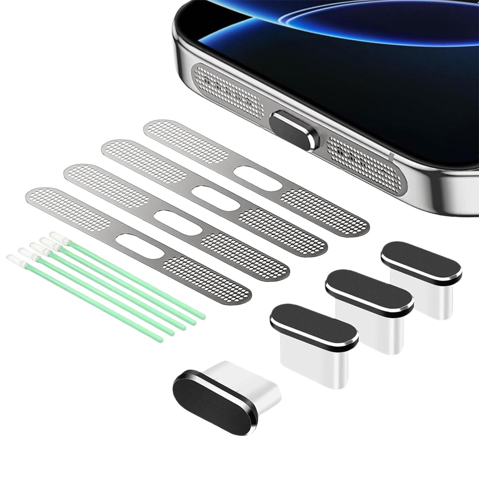Facile à installer et à retirer : Enlevez la poussière avec une brosse, alignez la couverture du connecteur USB-C ou le haut-parleur, puis appuyez simplement vers le bas. Pour retirer la protection ou la grille du haut-parleur, utilisez vos ongles ou une pince. Grille métallique anti-poussière : Protection pour écouteurs titan pour iPhone 16 Pro / 16 Pro Max / iPhone 15 Pro / 15 Pro Max Gardez votre téléphone propre et fonctionnel GRILLE ANTI-POUSSIÈRE EN Haut-Parleur Intérieur Pour IPHONE 11 Pro Max... Grille anti-poussière pour haut-parleurs : Ces protections pour haut-parleurs sont faites d'un filet fin amélioré pour protéger le haut-parleur de votre téléphone contre l'accumulation de poussière lors d'une utilisation prolongée. Autocollants Anti-poussière BelleVive Pour IPhone 16/15 Pro Elles contribuent grandement à prolonger la durée de vie des haut-parleurs du téléphone et assurent un fonctionnement durable Contenu de l'emballage : 2 bouchons anti-poussière pour Type-C en métal, 2 bouchons anti-poussière pour Type-C en silicone, 8 grilles de haut-parleurs, 2 brosses de nettoyage et 1 pince Kit Construction Navire De Guerre Lot De 8 Autocollants Anti-poussière Pour IPhone 16/15/Pro Kit Entretien Ports Téléphone Protection contre la poussière pour connecteurs USB-C : Notre ensemble de protections anti-poussière USB-C comprend deux types différents de protections (4 pièces). 1., Protection contre la poussière pour connecteurs USB-C : Notre ensemble de protections anti-poussière USB-C comprend deux types différents de protections (4 pièces). L'extrémité en aluminium garantit une longue durée de vie et un branchement facile., La2., Facile à installer et à retirer : Enlevez la poussière avec une brosse, alignez la couverture du connecteur USB-C ou le haut-parleur, puis appuyez simplement vers le bas.