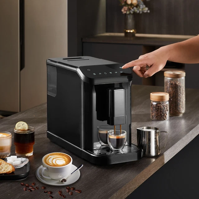 Machine à expresso , cafetière expresso 15 bars avec mousseur à lait et buse vapeur, machine à cappuccino latte semi-automatique professionnelle avec écran tactile et réservoir d'eau amovible, système de contrôle NTC Conception réfléchie : le réservoir d'eau amovible de grande capacité de 1,5 L vous évite d'avoir à le remplir fréquemment. Savourez l'essence d'un café parfait grâce à notre système de vapeur haute pression de 15 bars, qui extrait rapidement l'arôme profond du café et produit une infusion dense et aromatique. Le contrôle de la température PID garantit une température d'infusion optimale de 90 °C, pour un café de qualité supérieure Broyeur intégré et broyage réglable : notre machine à expresso automatique dispose d'un broyeur intégré et d'une trémie spacieuse de 180 g, vous permettant de transformer vos grains en expresso en quelques secondes Extraction à haute pression : améliorez votre expérience de préparation du café. De plus, la machine à expresso est dotée d'un rappel de détartrage, d'une protection contre la surchauffe et d'une protection automatique contre la libération de pression, assurant une fiabilité à long terme et prolongeant la durée de vie de la machine. Philips EP1224 - Machine à café expresso avec broyeur - Interface LED One touch - Détartrage De plus, le bac d'égouttage, le réservoir d'eau de 1,5 L et l'unité d'infusion sont facilement détachables pour un nettoyage pratique. Machine à expresso automatique VEVORDécouvrez l'excellence de l'espresso à la maisonLa machine à expresso automatique VEVOR allie commodité et performance pour offrir la tasse de café parfaite. Avec sa trémie à grains spacieuse de 180 g, vous pouvez déguster du café frais moulu sans avoir à les remplir fréquemment. SpécificationsNuméro de modèle de l'article : CM9002E-GSCapacité du réservoir d'eau : 1,5 LCapacité du récipient à grains : 180 gHaute pression : 15 barsParamètres de broyage : 1 à 15 niveauxCapacité de la tasse : 40 mLPoids du produit : 16,8 lb / 7,6 kgContenu du Colis1 x brosse de nettoyage Extraction à haute pressionL'extraction haute pression de 15 bars garantit que chaque tasse libère pleinement la riche saveur de vos grains de café. Notre machine à café élimine automatiquement les impuretés avant le démarrage et l'arrêt. Le système d'extraction haute pression de 15 bars et la technologie de chauffage rapide assurent que l'eau s'infuse pleinement du café, en extrayant une saveur riche et aromatique qui ravit vos sens. Doté d'un moulin intégré avec 15 réglages réglables et d'une extraction haute pression de 15 bars, il transforme sans effort vos grains préférés en un expresso riche et aromatique.