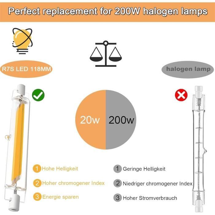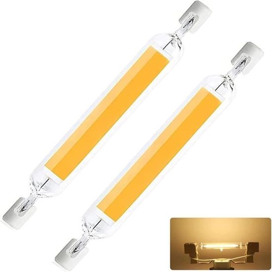 GDYOD Ampoules R7S LED 118mm Dimmable,LED R7S 118mm 20W Équivalent à Ampoule Halogène 200W, Sans Scintillement,AC 220-240V,Blanc Chaud 3000K 2000LM,Éclairage à Faisceau 360°, Lot de 2 [Classe énergétique F éclairage à LED haute luminosité, faible consommation d'énergie. Ampoule R7S LED 118mm Dimmable, 20W R7S Ampoules LED COB, R7S LED 118mm Dimmable 20w R7s Ampoules Led Cob R7s Led 118mm Haute Lumire Blanc Froid 6000k 1000lm Clairage Faisceau 360 Sans Scintillement Ac 220 240v Pack De 2 Classe Nergti 69598072 【R7S LED 118MM】Ampoule LED Hightlight Dimmable R7S 118mm 20W, LED COB double extrémité 2000LM,douille de lampe céramique à faible teneur calories, structure connexion antidéflagrante, puce LED COB haute qualité Il soulage la fatigue de la vue, protège votre oeil Remarque : si le gradateur n'est pas compatible, clignotera lorsqu'il sera atténué Les clients expriment leur mécontentement concernant la luminosité, la qualité et le scintillement de ces ampoules. Ils mentionnent que la puissance annoncée est fausse et que le produit est quasiment inutilisable Ampoules R7S LED 118mm 20w Dimmable, R7S LED 118mm 20W Équivalent à Avec une durée de vie d'environ 30 000 heures, il est plus sûr à utiliser, ce qui vous fait gagner un temps précieux et de l'argent Pas de plomb ni de mercure, pas de rayonnement UV ou IR. Réduit la consommation d'énergie de plus de 90%.